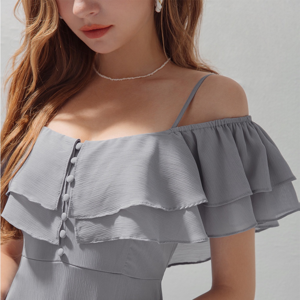 AIR SPACE 雙層荷葉挖肩開衩雪紡長洋裝(灰藍)