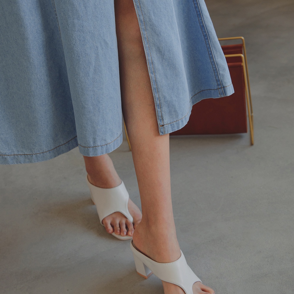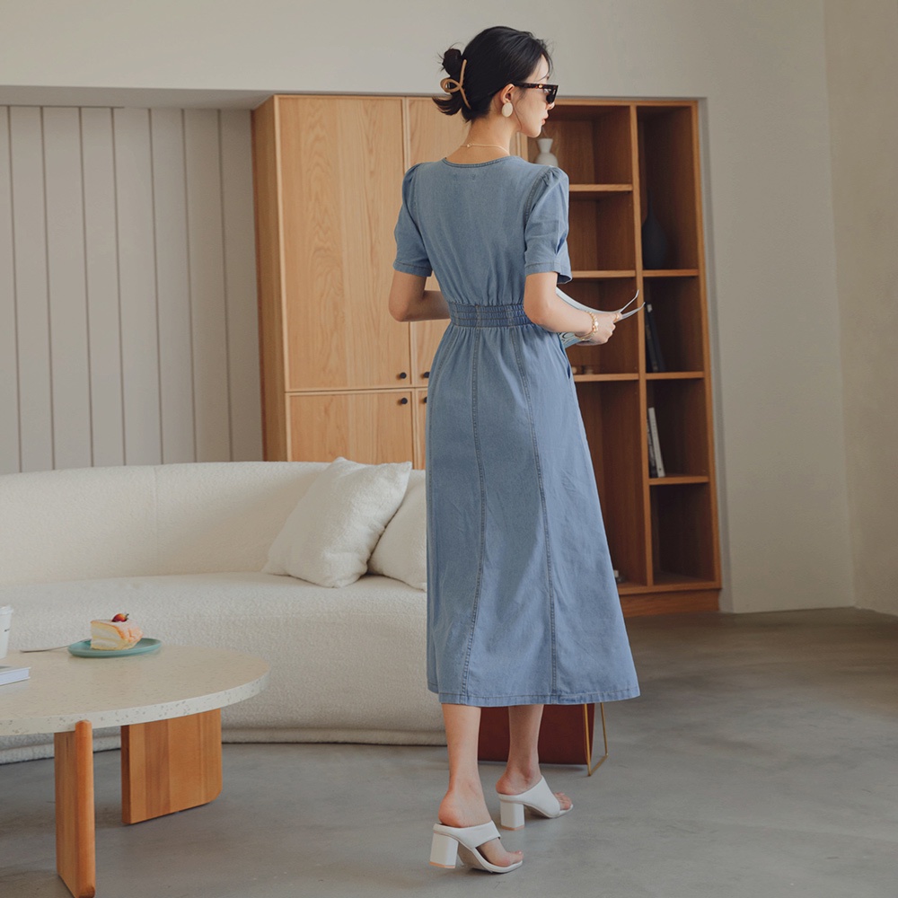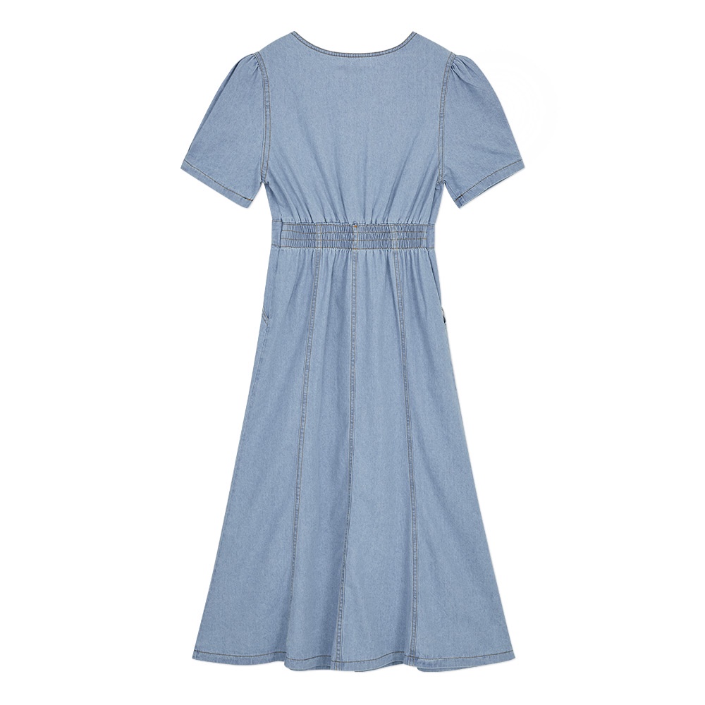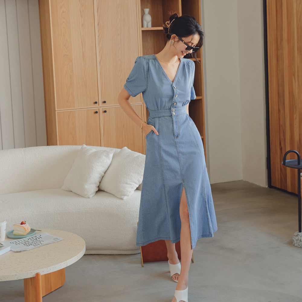 AIR SPACE LADY 牛仔車線排釦開衩長洋裝(淺藍)