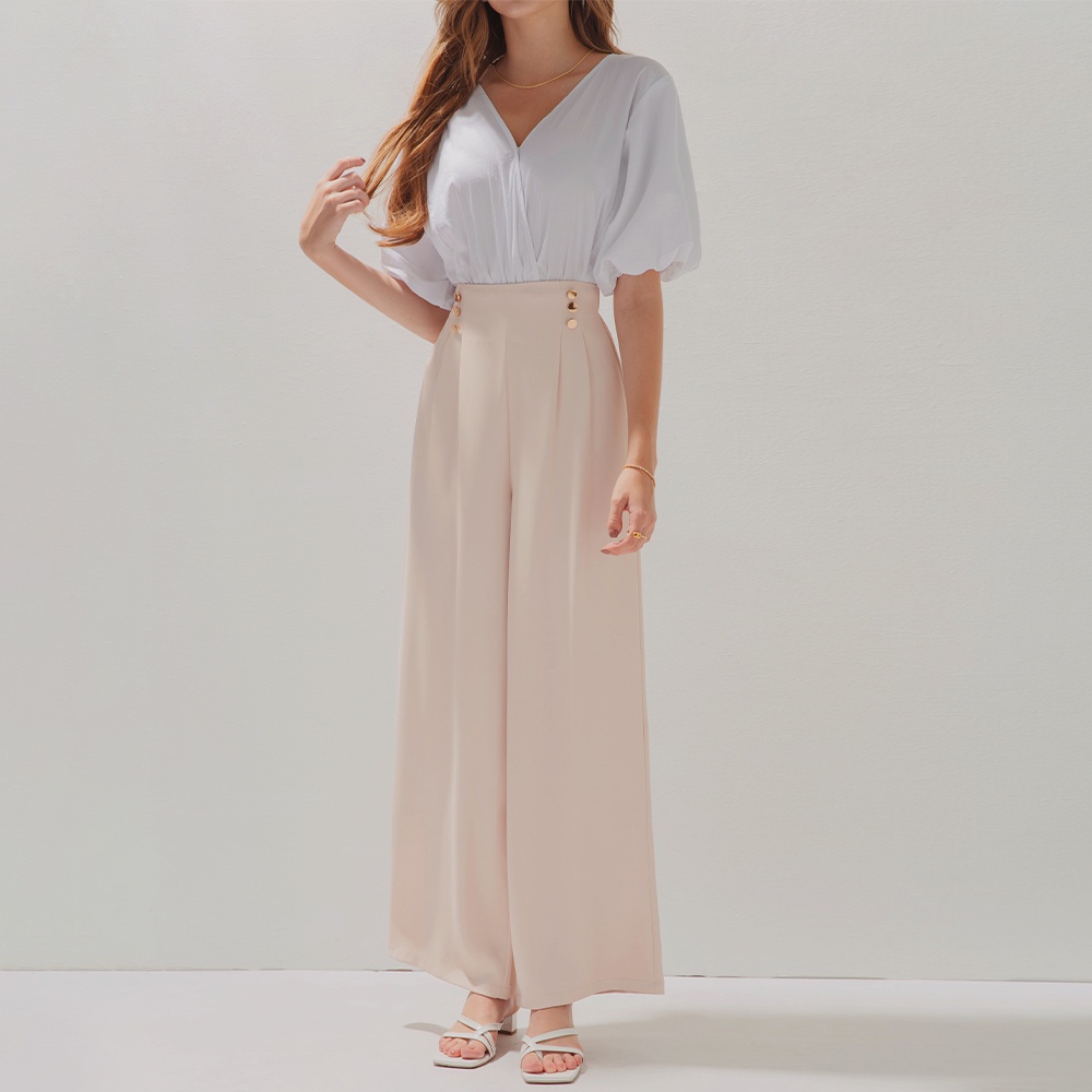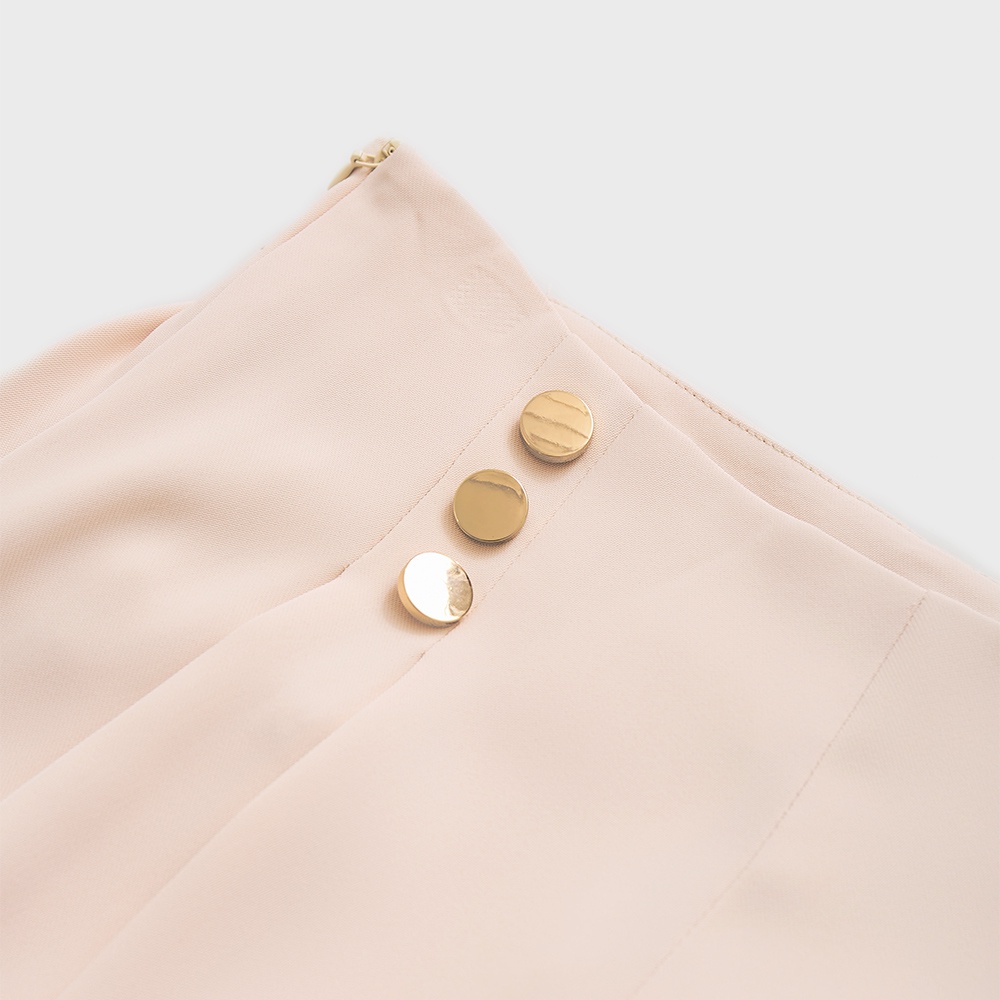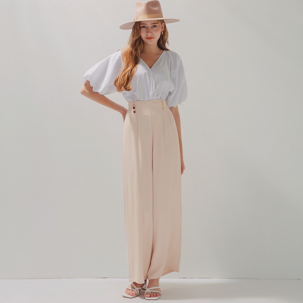 AIR SPACE 高腰雙排釦打褶鬆緊寬褲(粉杏)