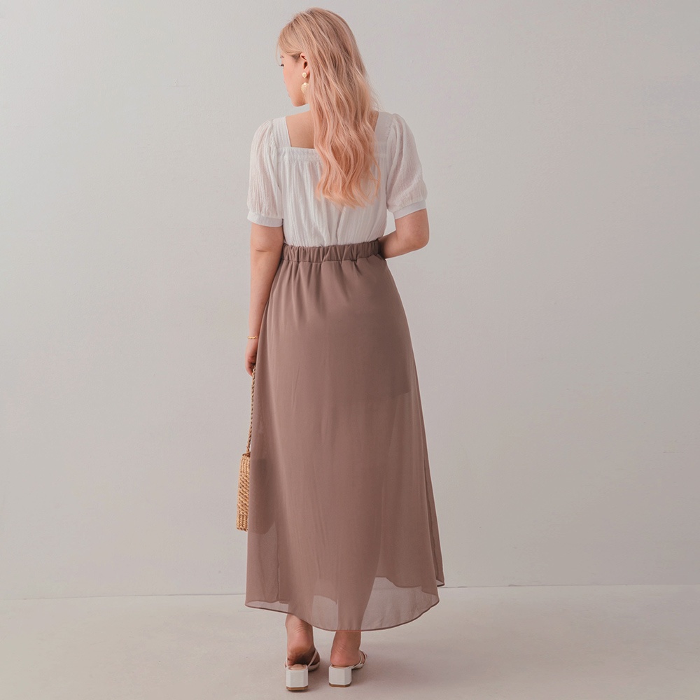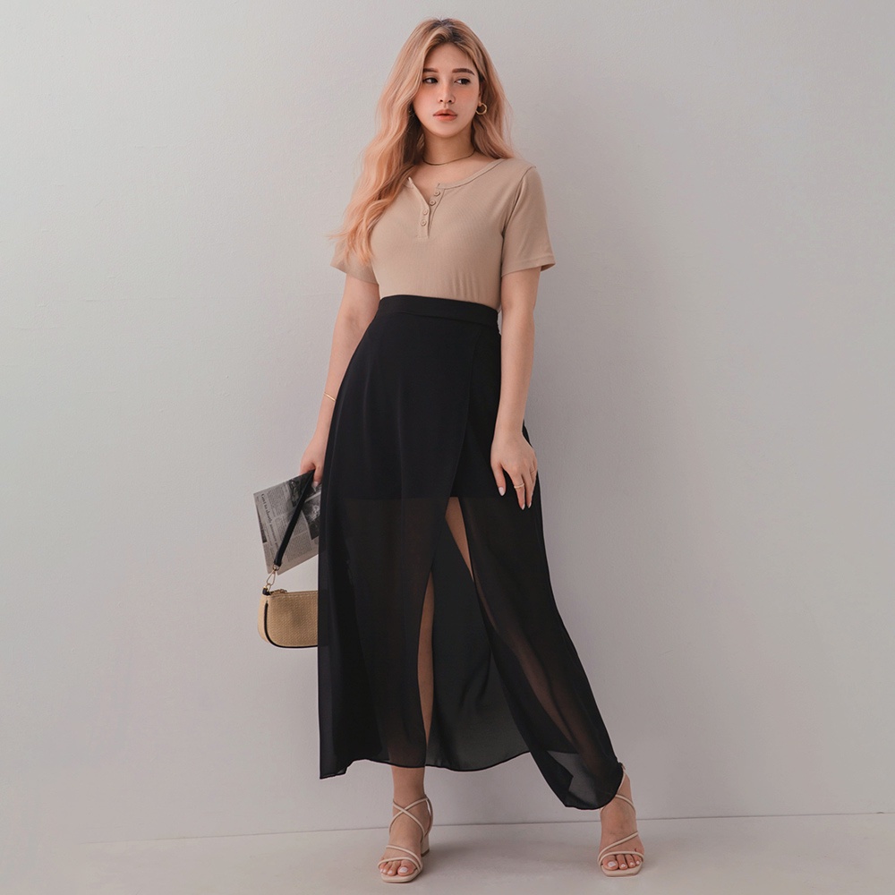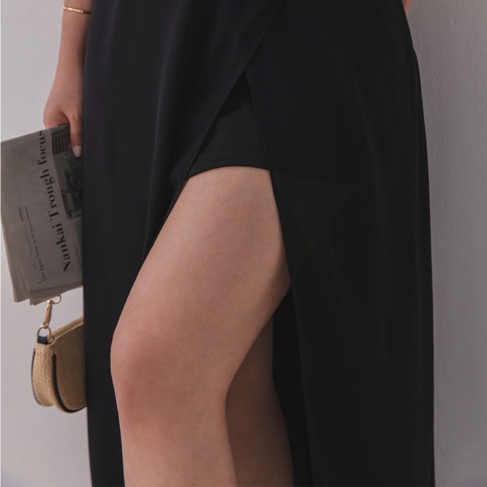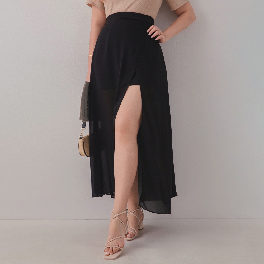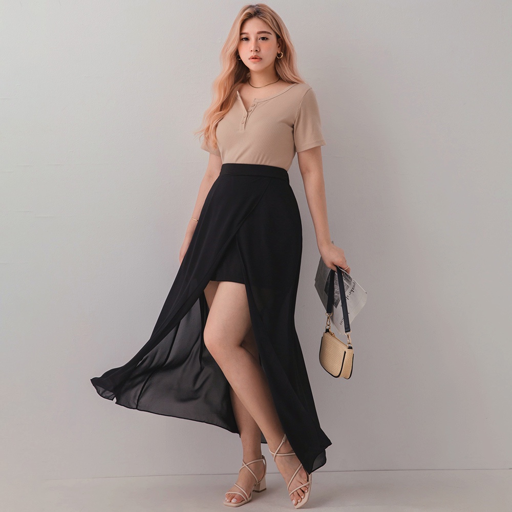 AIR SPACE PLUS 中大尺碼 交疊透視開衩雪紡長裙(黑/咖啡)