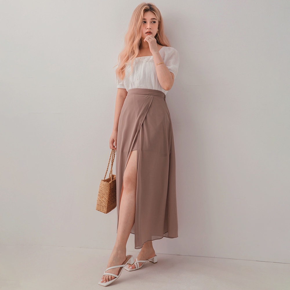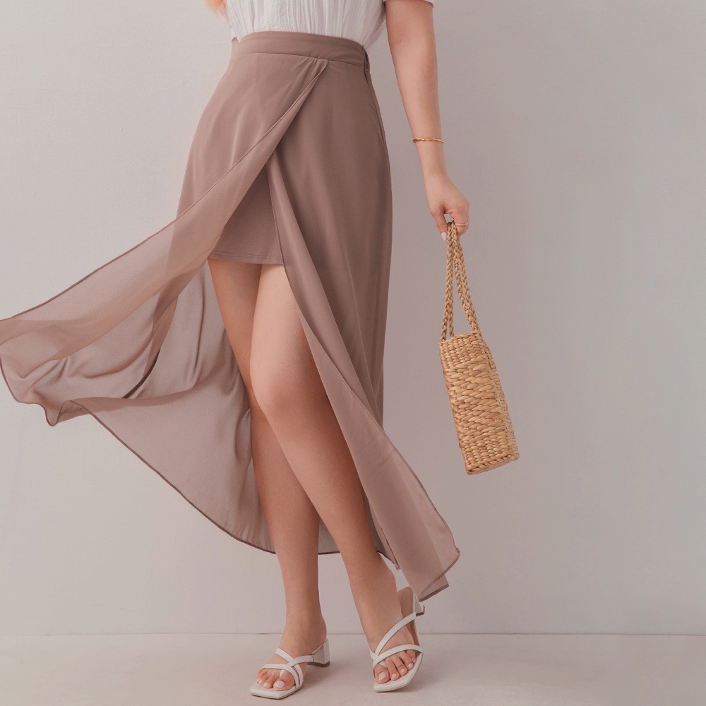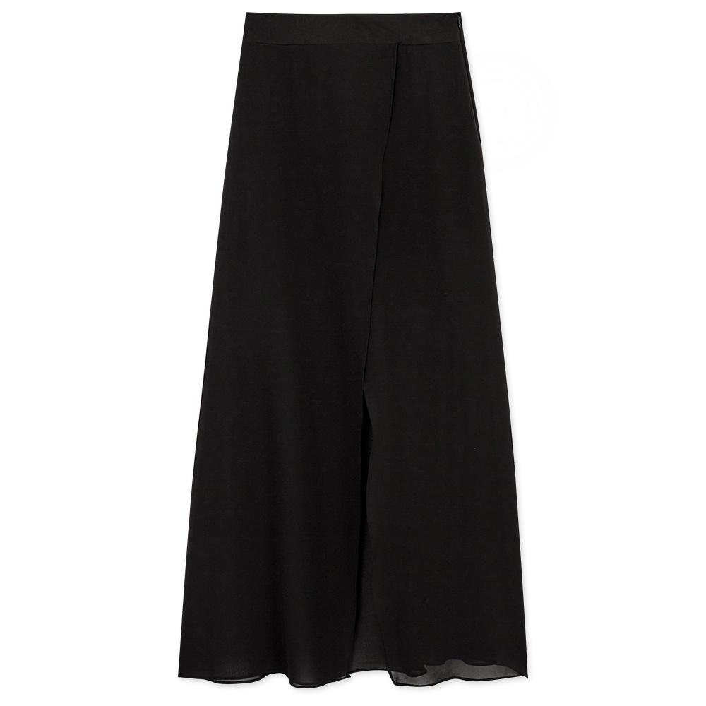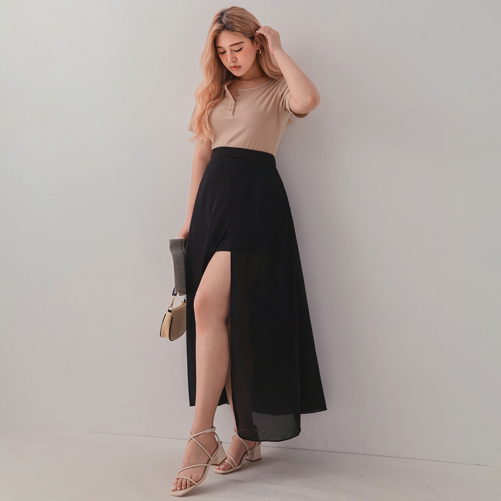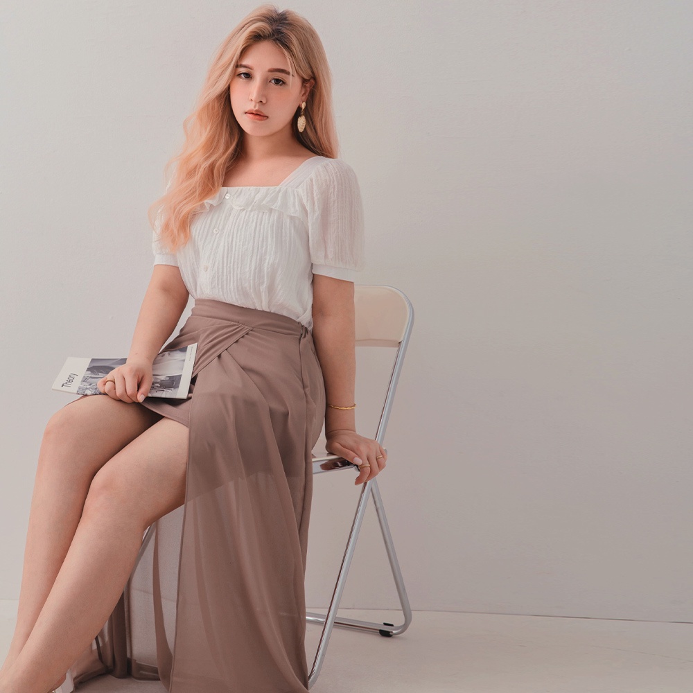 AIR SPACE PLUS 中大尺碼 交疊透視開衩雪紡長裙(黑/咖啡)