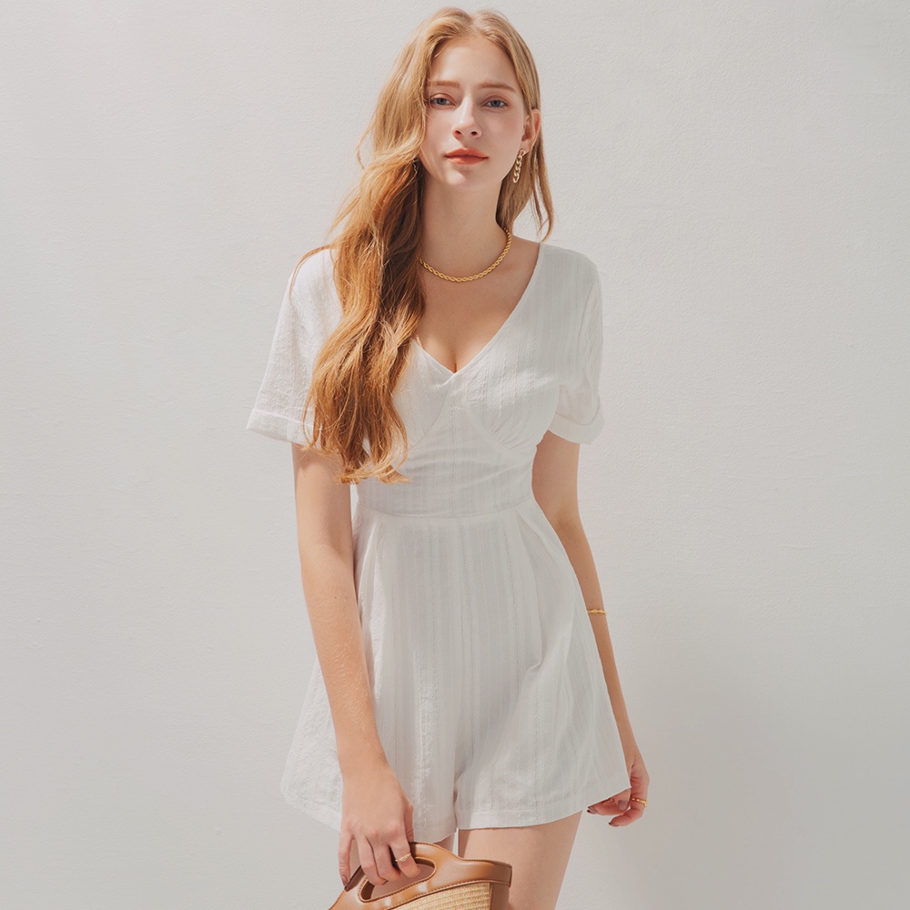 AIR SPACE V領印花織紋連身短褲(白)