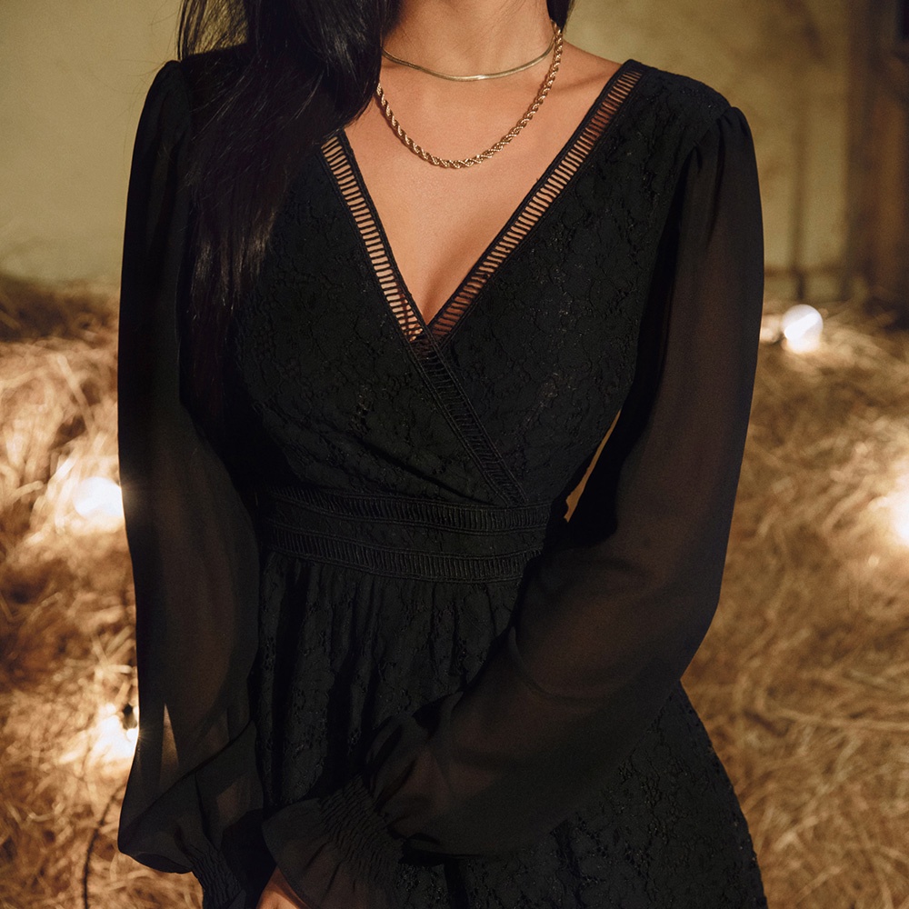 AIR SPACE V領鏤空織紋蕾絲短洋裝(白/黑) 女裝 現貨秋冬 韓系 歐美 長袖 約會 晚宴 宴會 派對 透膚