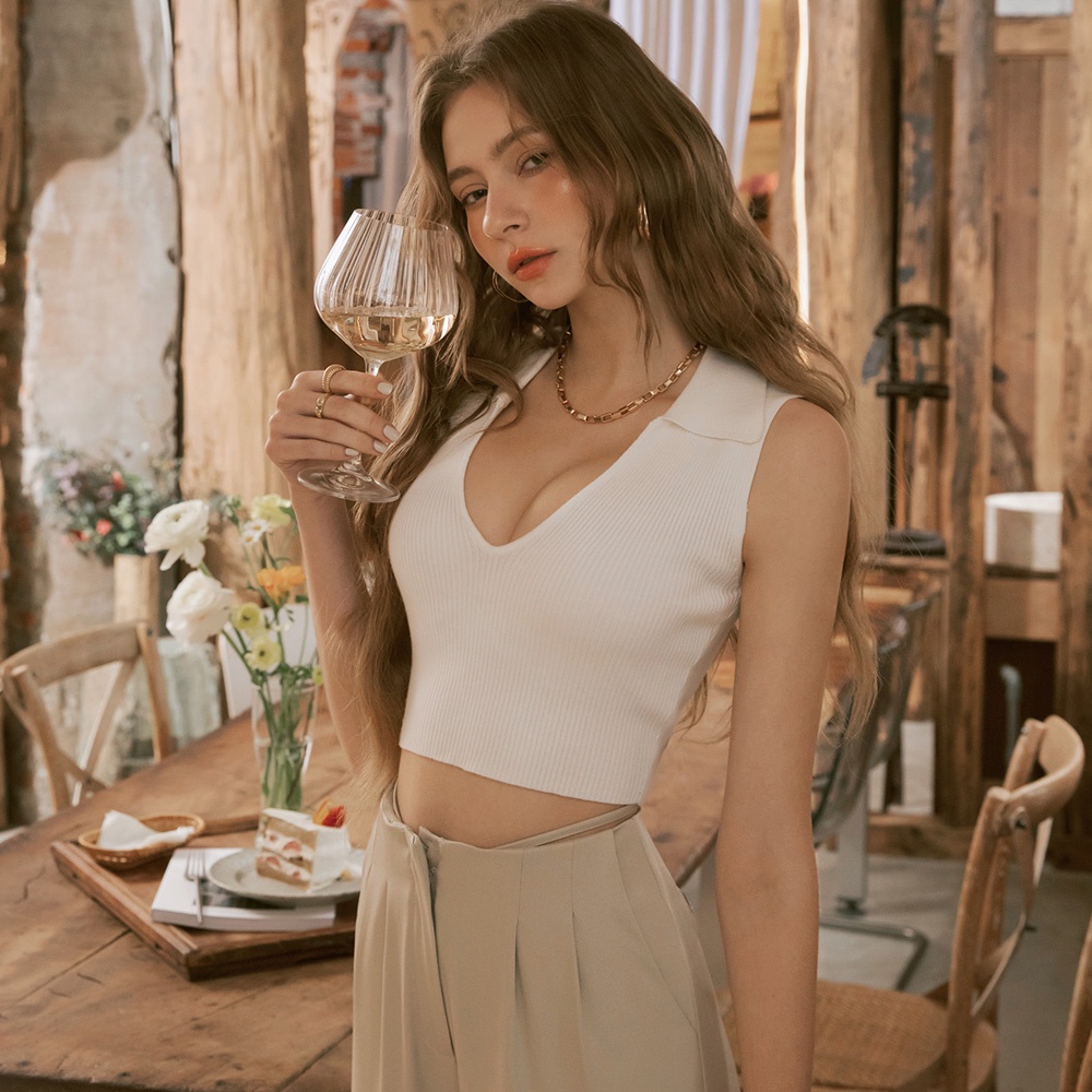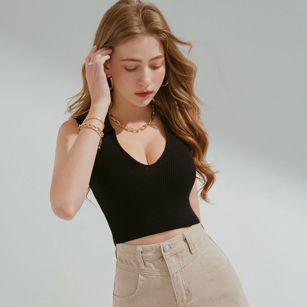AIR SPACE 低胸翻領短版針織背心(白/黑) 女裝 現貨