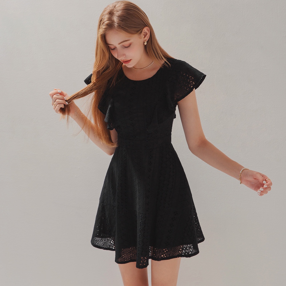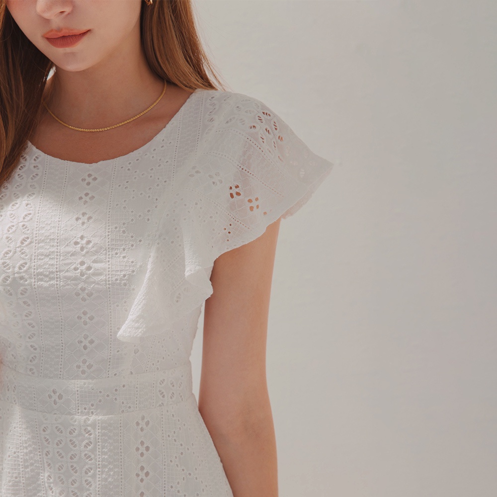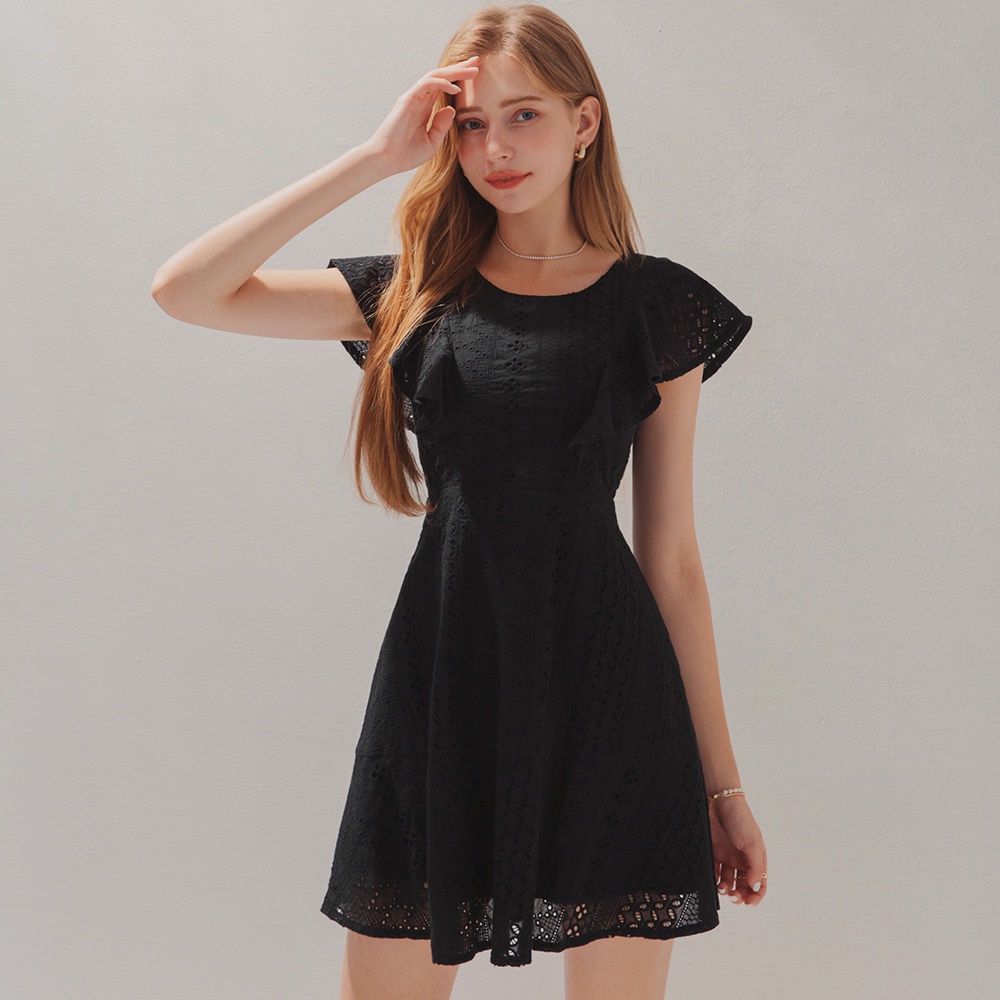 AIR SPACE 燒花蕾絲荷葉邊袖短洋裝(白/黑)