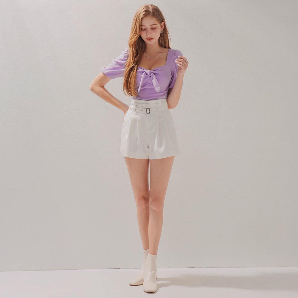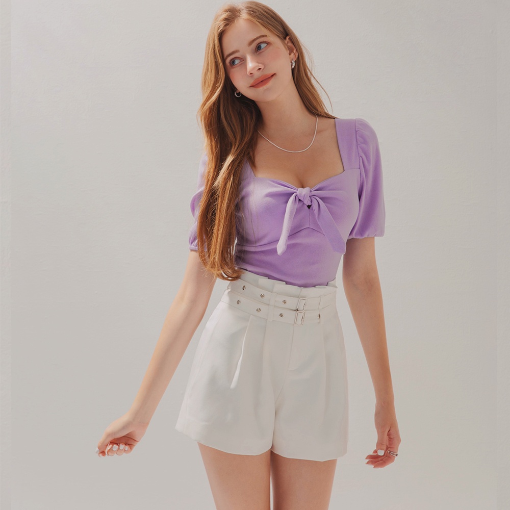 AIR SPACE 方領前綁帶造型短版上衣(白/紫)