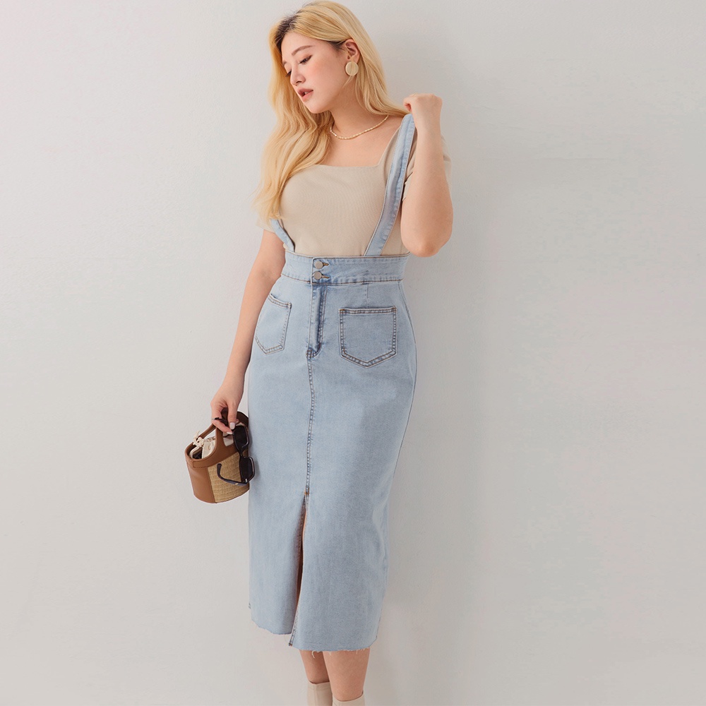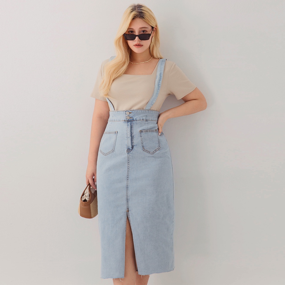 AIR SPACE PLUS 中大尺碼 2WAY高腰開衩牛仔鉛筆裙(淺藍)