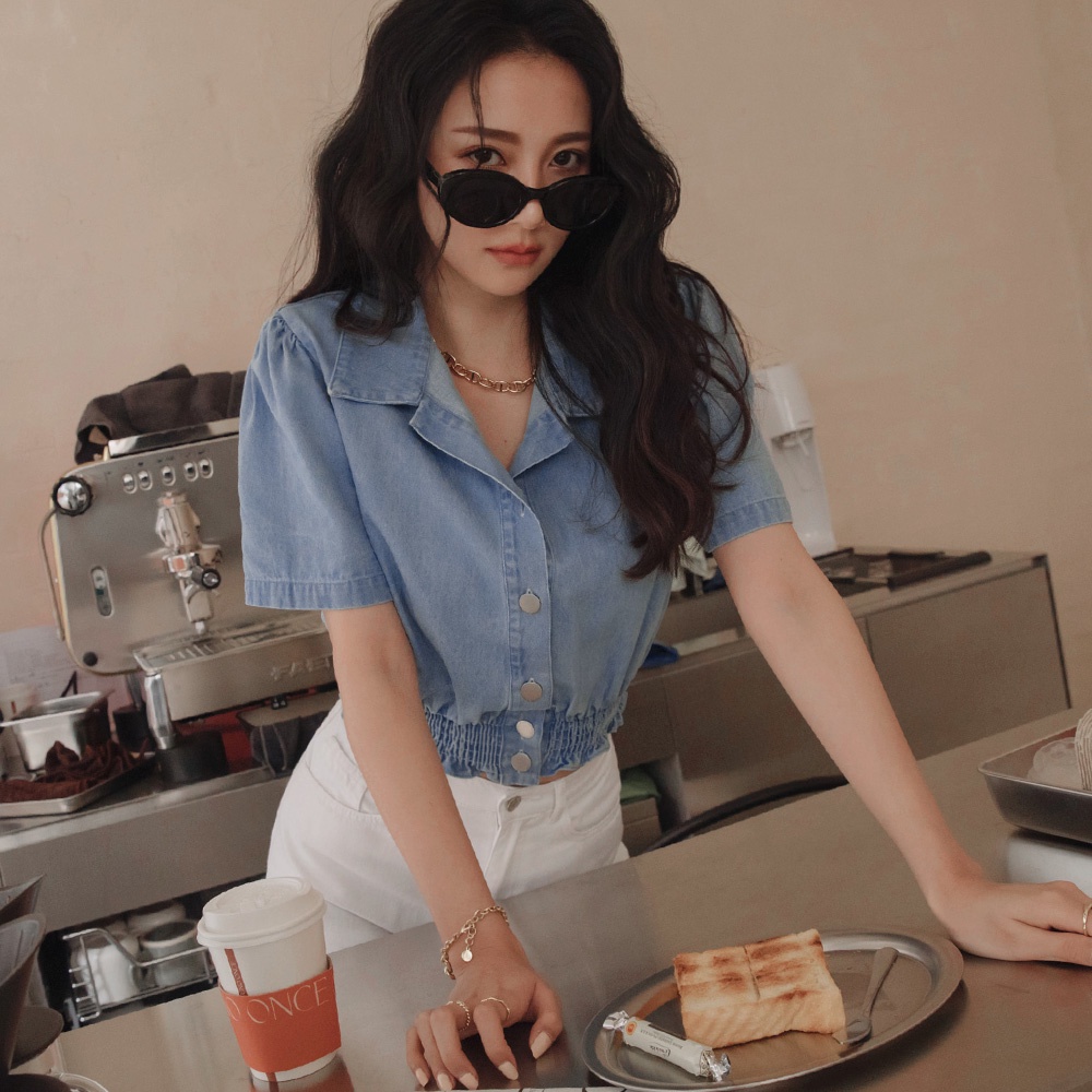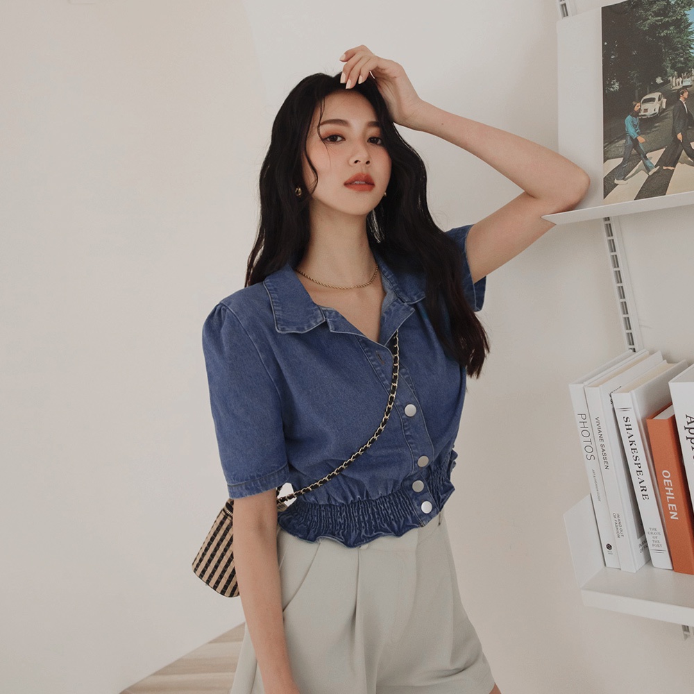 AIR SPACE LADY 下擺縮腰排釦短版牛仔上衣(淺藍/藍) 女裝 現貨