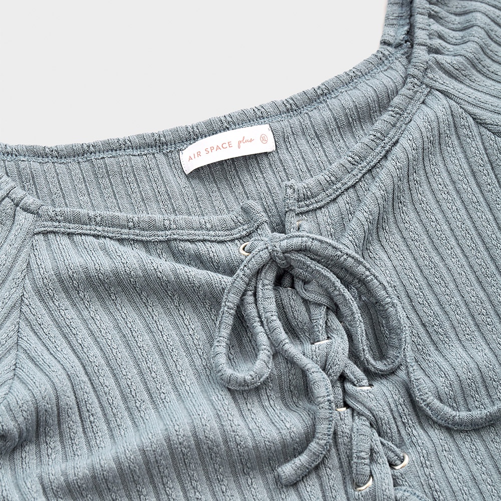 AIR SPACE PLUS 中大尺碼 方領交叉綁帶壓紋上衣(灰藍/黑) 女裝 現貨 大尺碼 中大尺碼