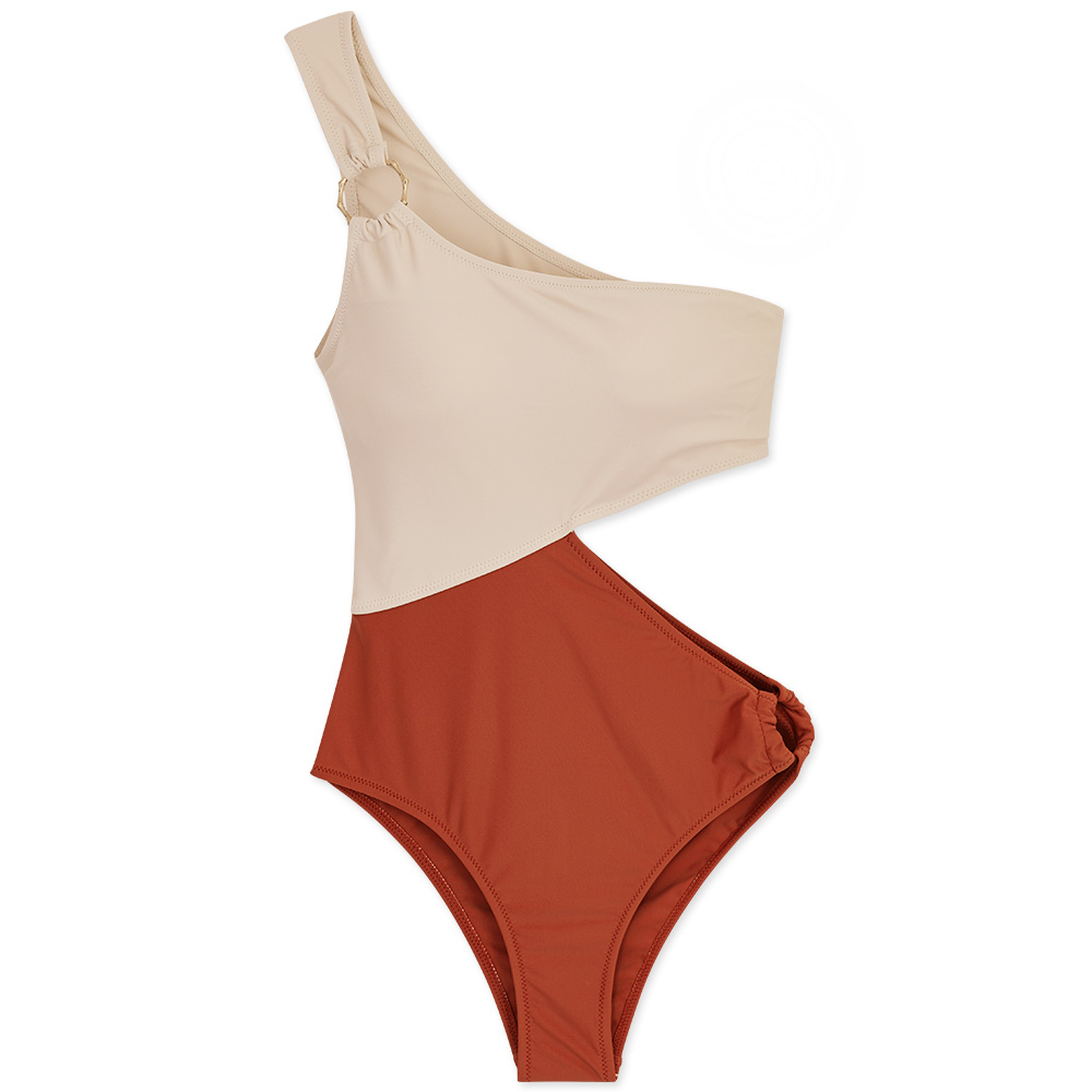 AIR SPACE 【MIKA聯名】單肩飾環撞色鏤空連身泳衣(星光白綠/裸粉紅棕) 泳裝 現貨 歐美風 自然美胸