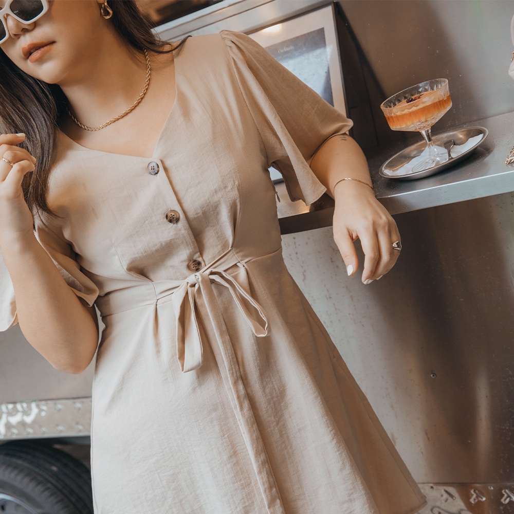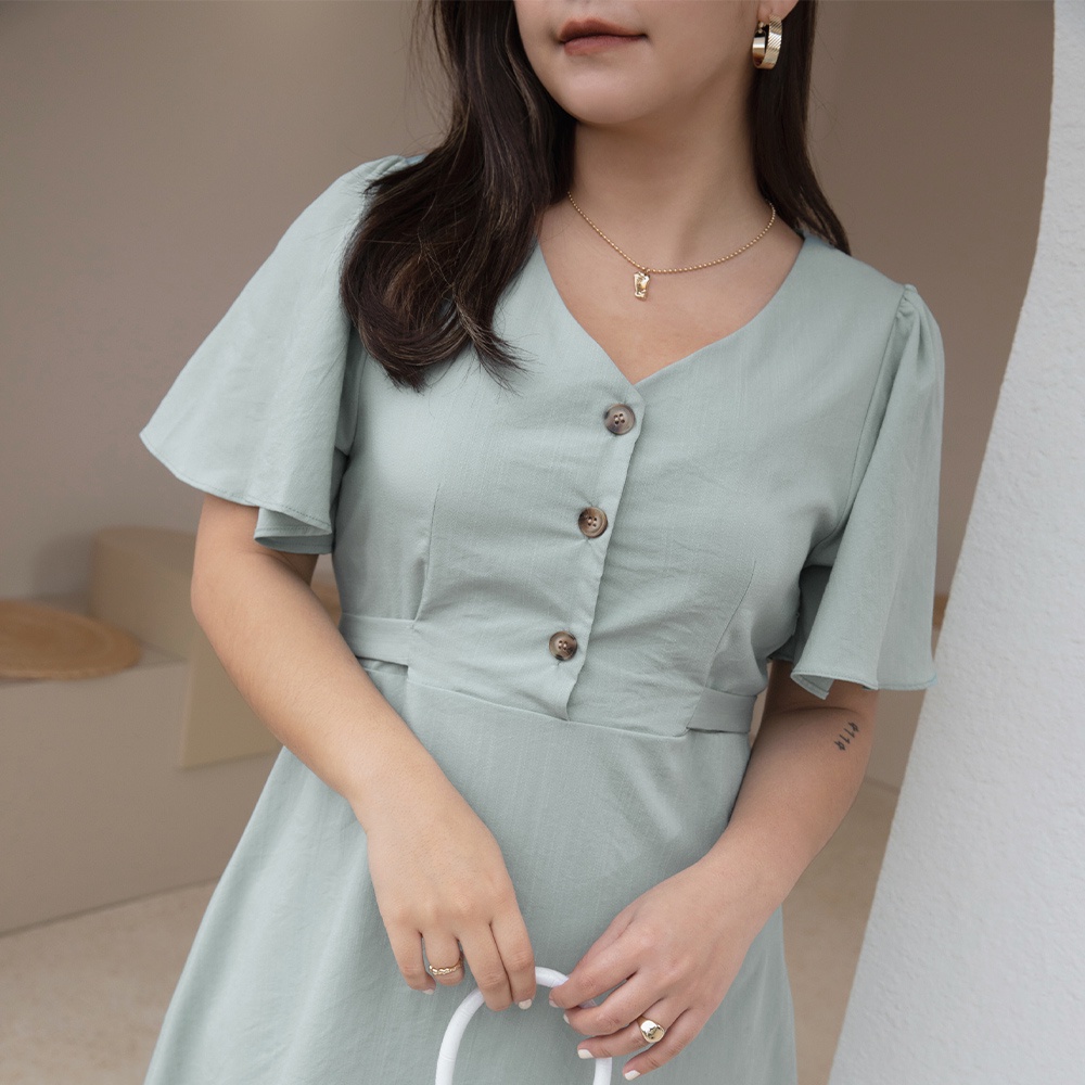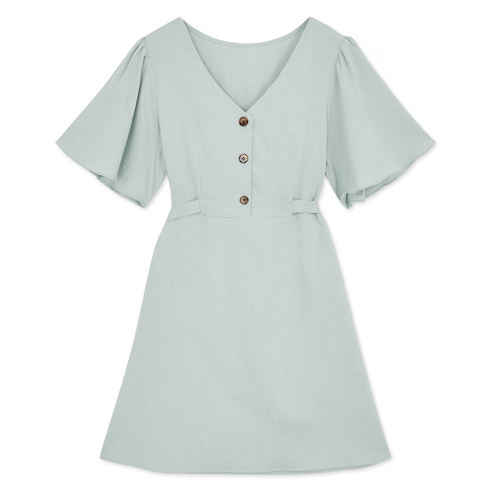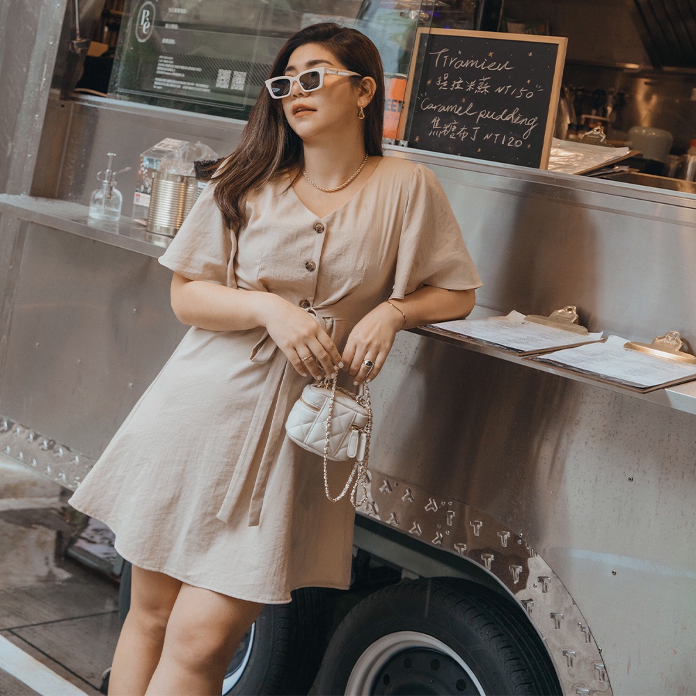 AIR SPACE LADY 中大尺碼 V領排釦寬袖綁帶短洋裝(杏/灰綠) 女裝 現貨 大尺碼