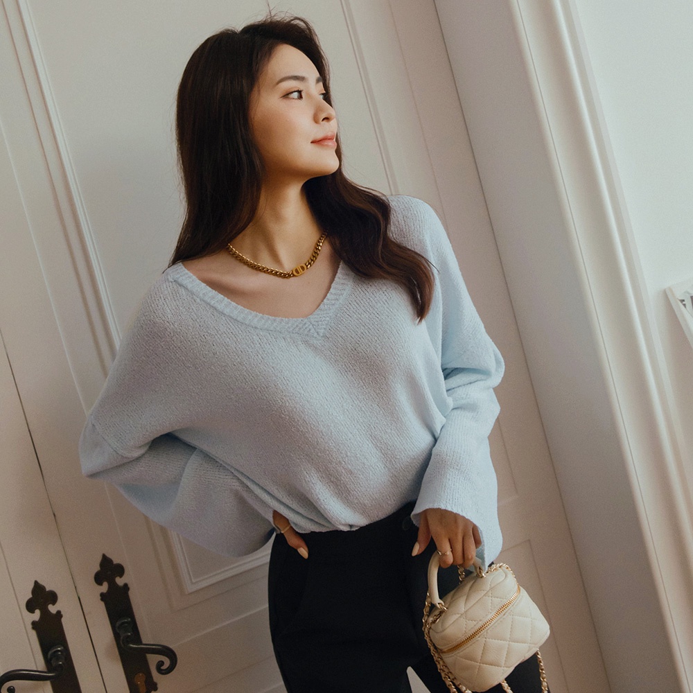 AIR SPACE LADY 慵懶V領寬袖針織上衣(淺藍/米白/卡其) 女裝 現貨