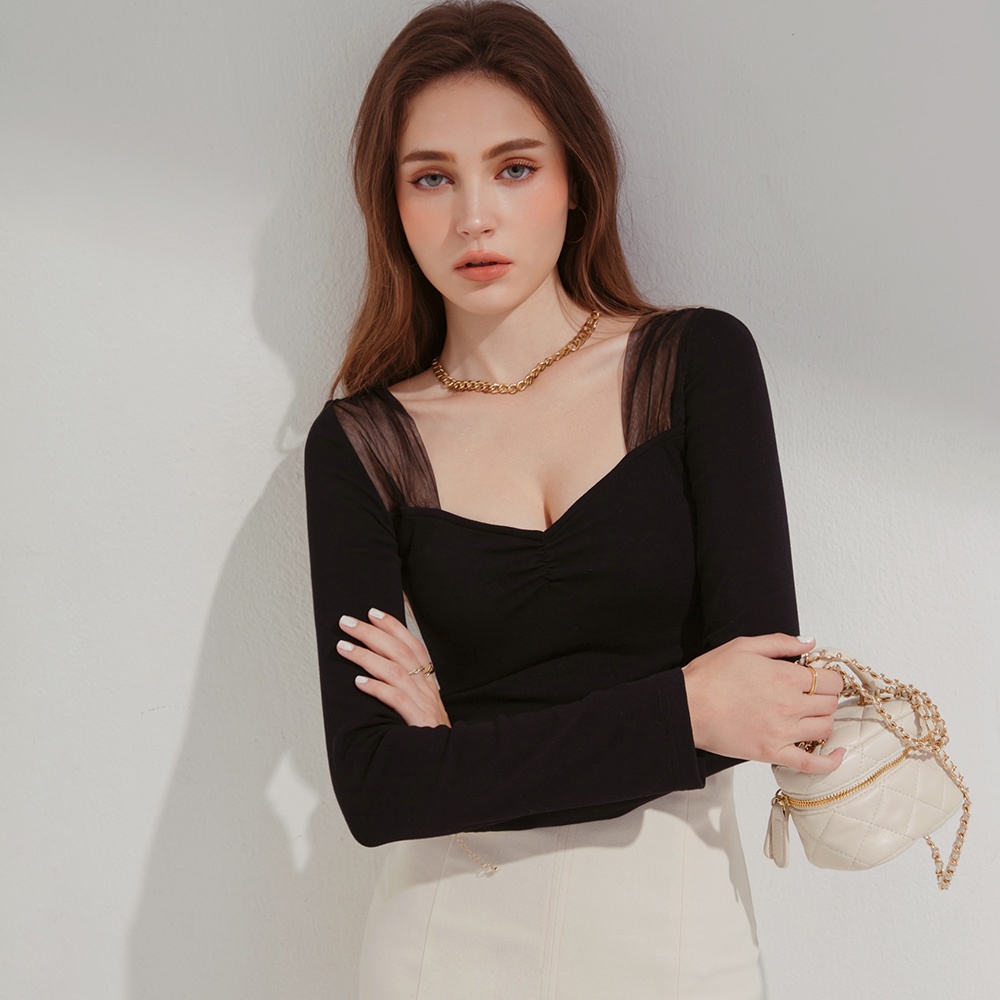 AIR SPACE PLUS 方領拚紗短版上衣(黑/卡其) 女裝 現貨 大尺碼 中大尺碼