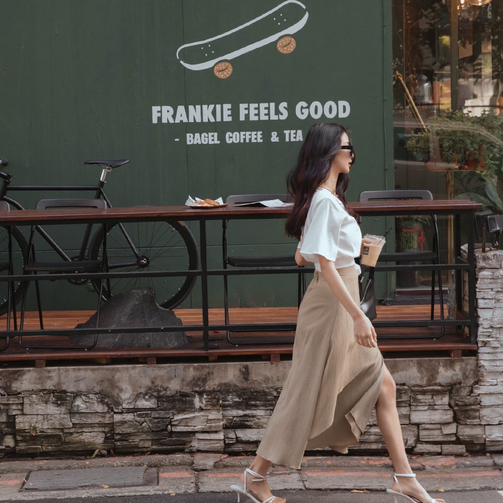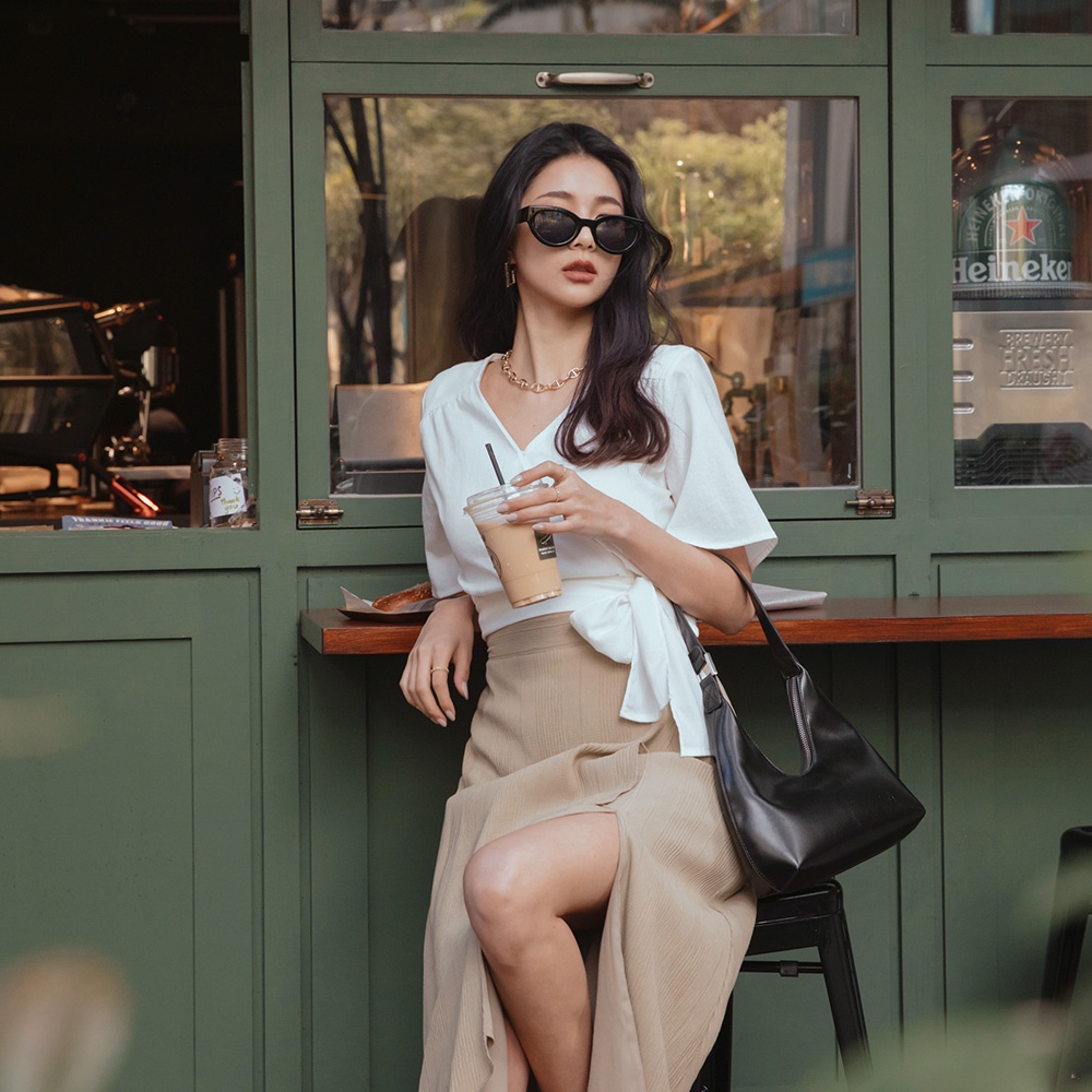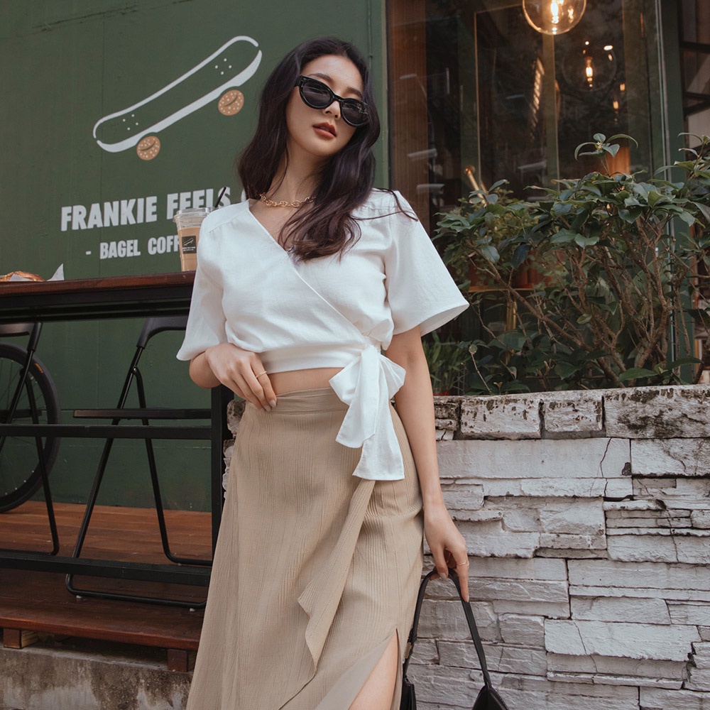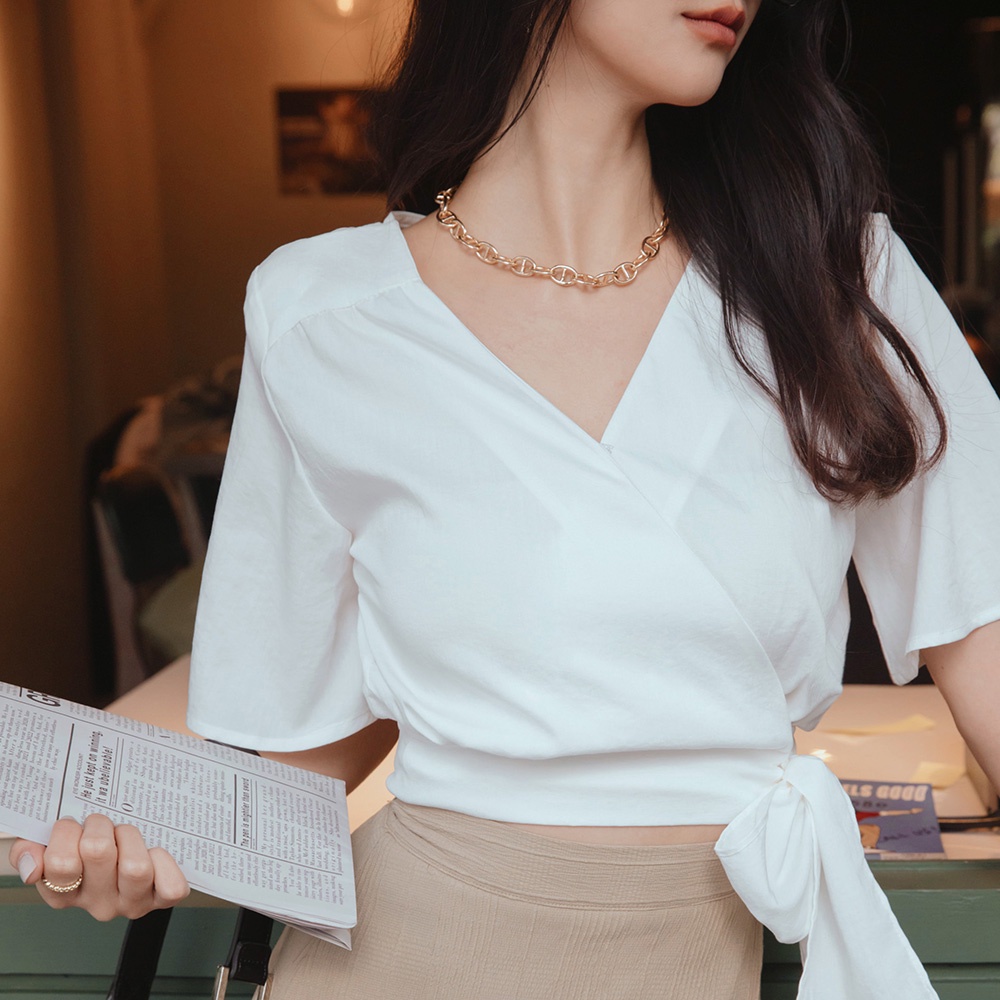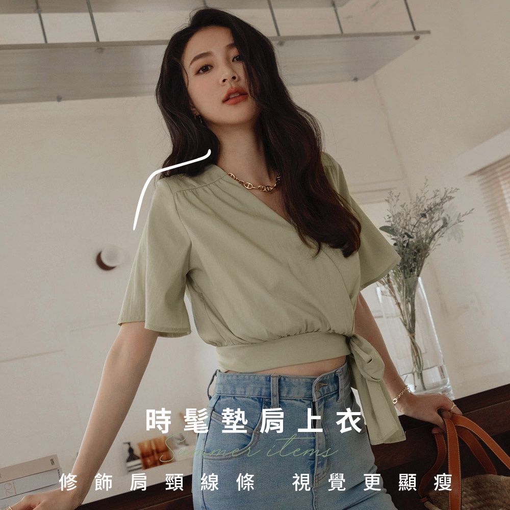 AIR SPACE LADY 交疊側綁短版墊肩上衣(灰綠/白) 女裝 現貨