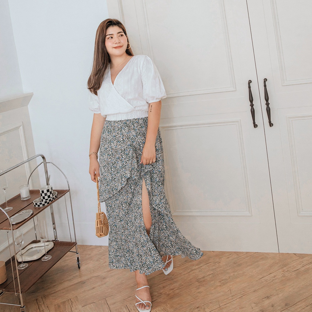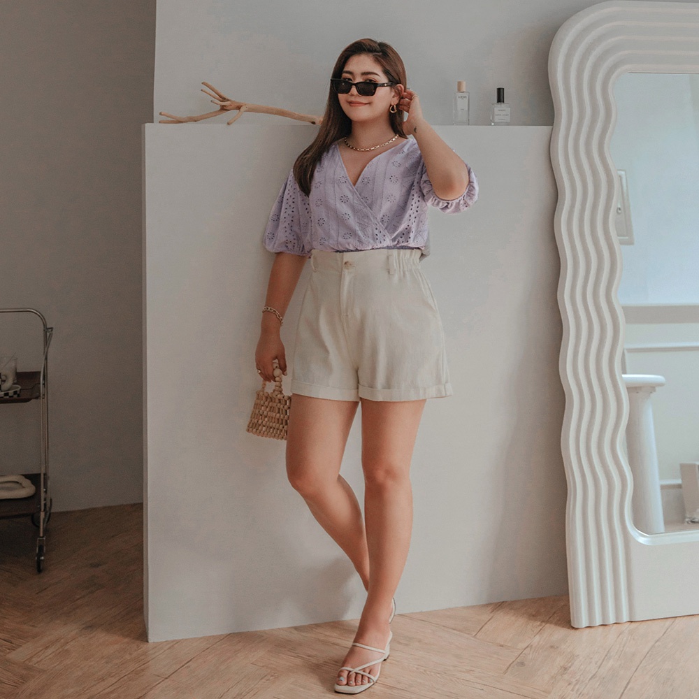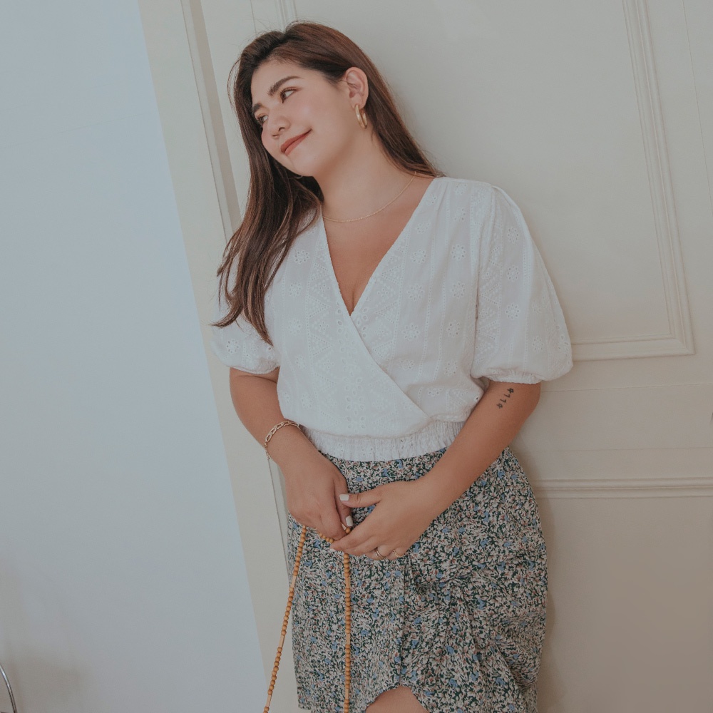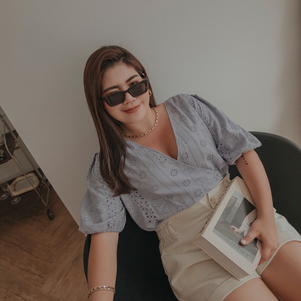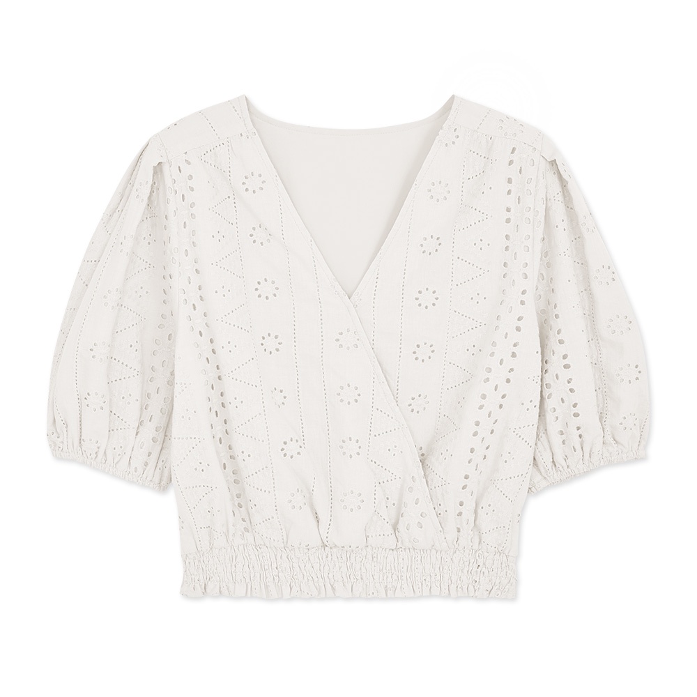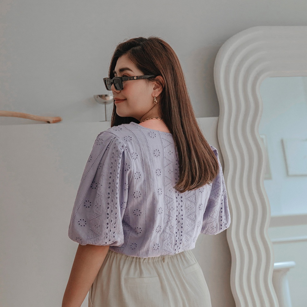 AIR SPACE PLUS 交叉領燒花蕾絲澎袖縮腰上衣(白/藍紫) 女裝 現貨 大尺碼 中大尺碼