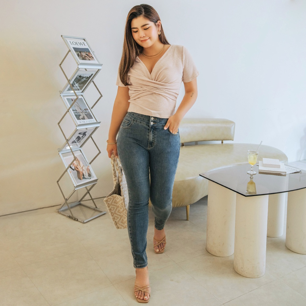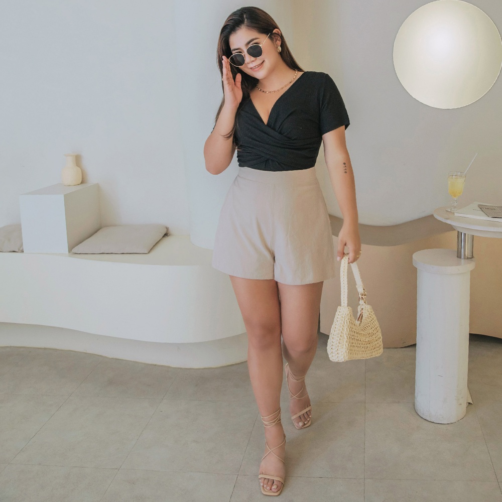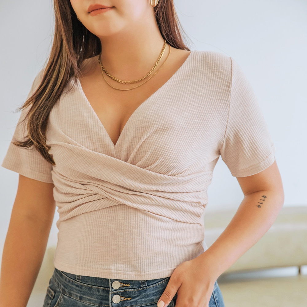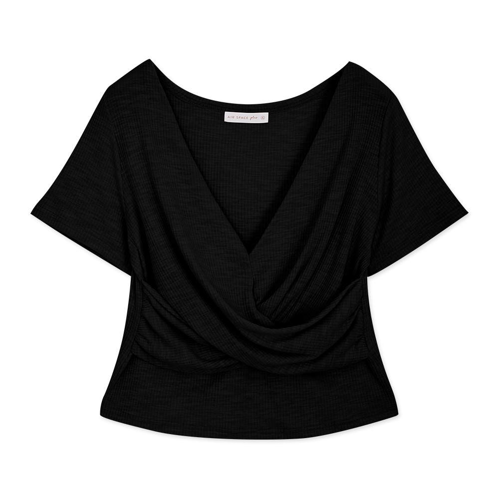 AIR SPACE PLUS V領交叉造型上衣(米杏/黑) 女裝 現貨 大尺碼 中大尺碼