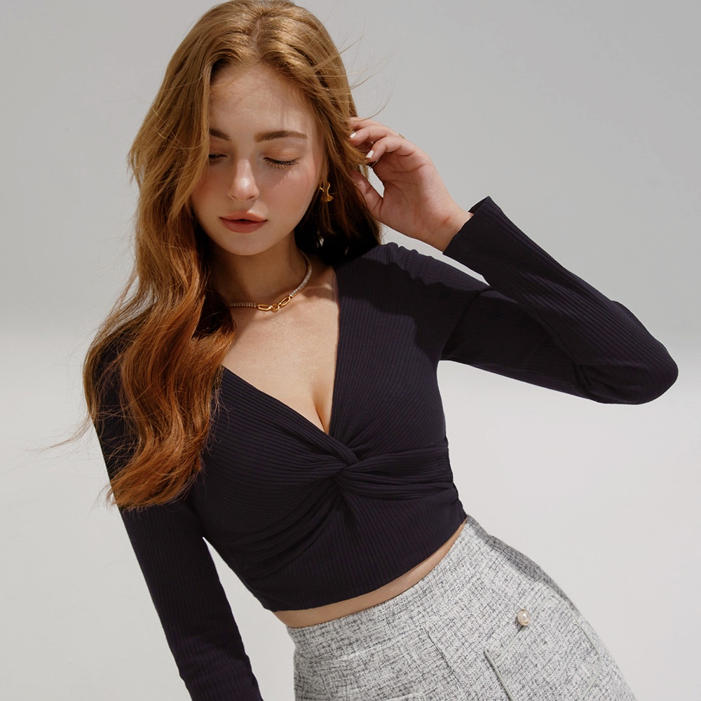 AIR SPACE V領扭結羅紋短版上衣(卡其/黑) 女裝 現貨