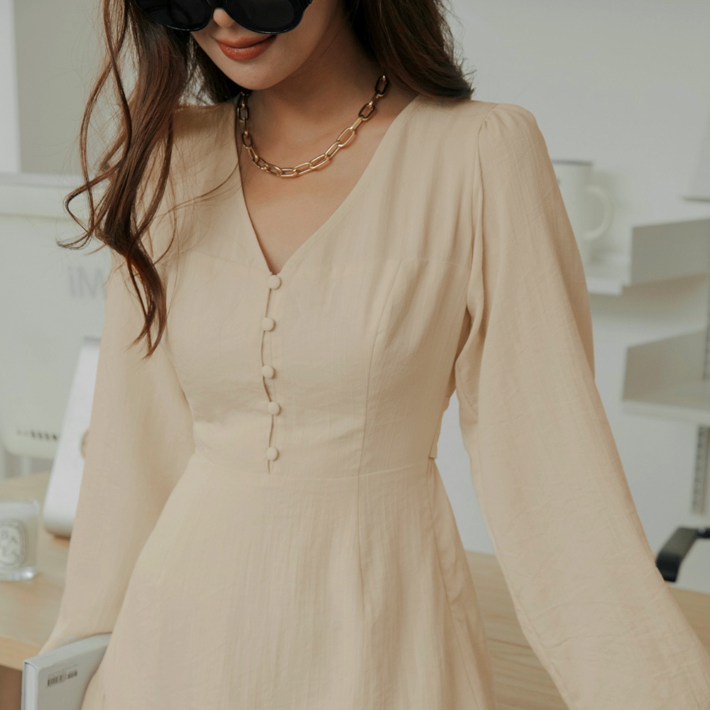 AIR SPACE LADY V領澎袖排釦綁帶短洋裝(灰藍/杏) 女裝 現貨