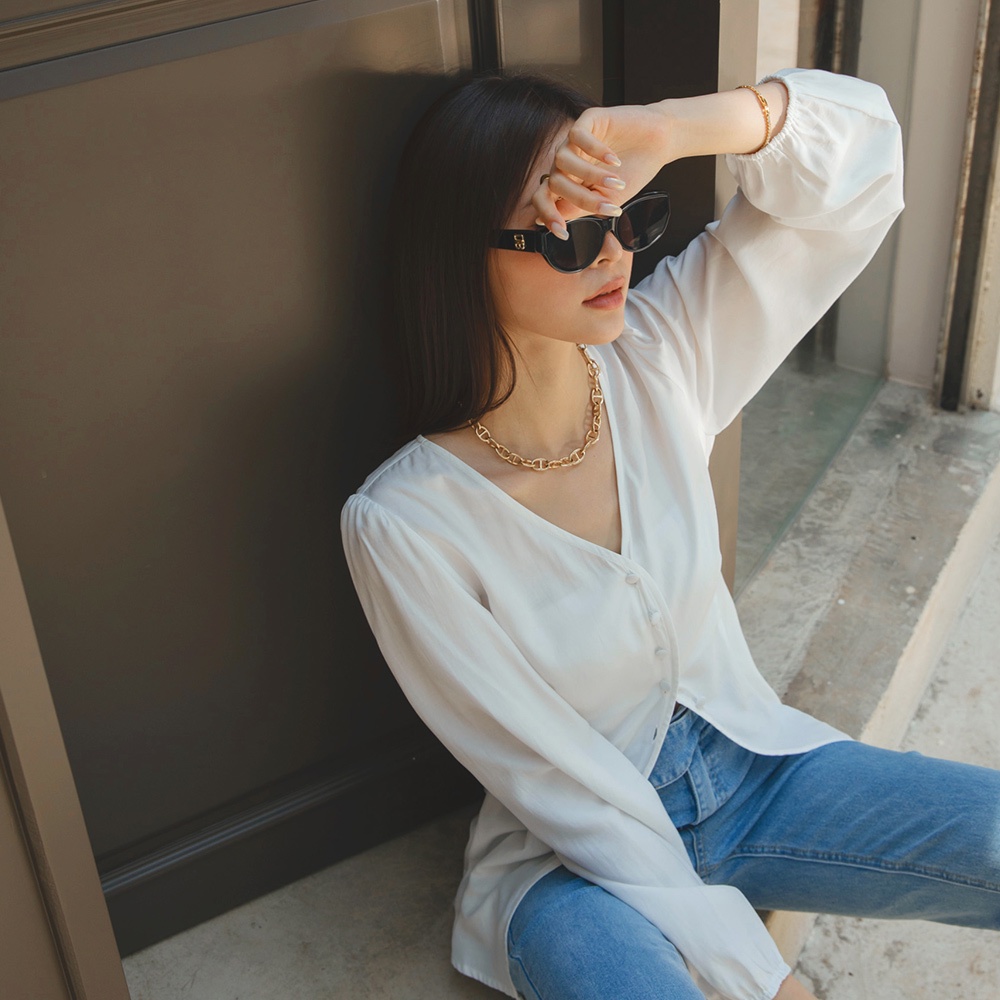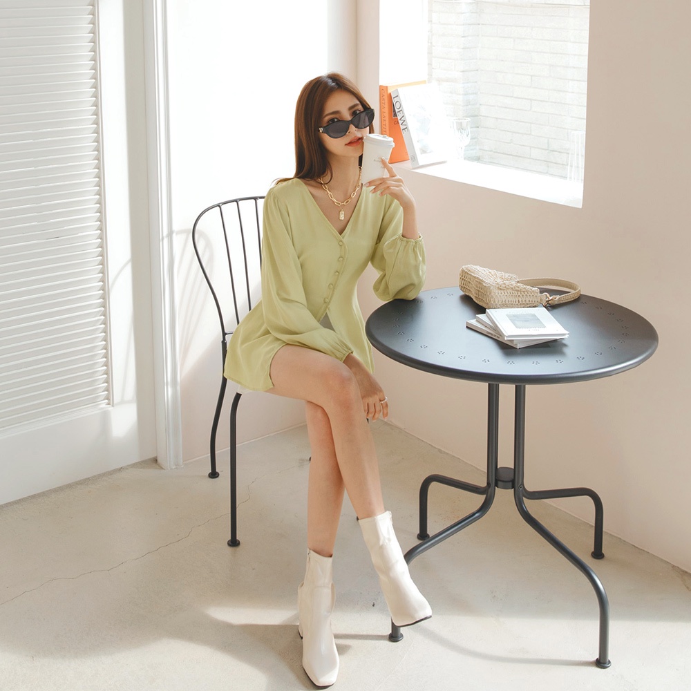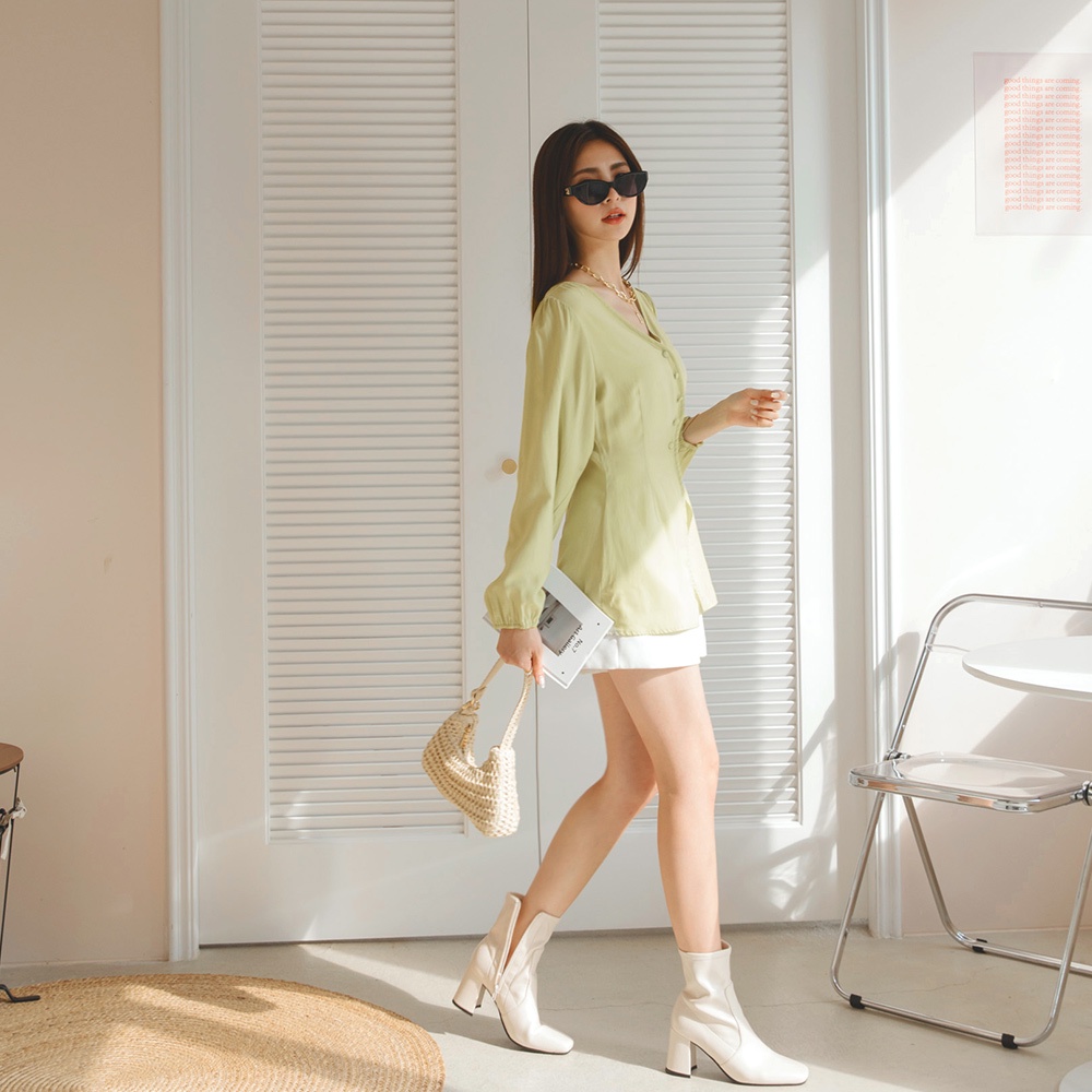 AIR SPACE LADY 柔霧V領排釦開衩上衣(白/綠) 女裝 現貨