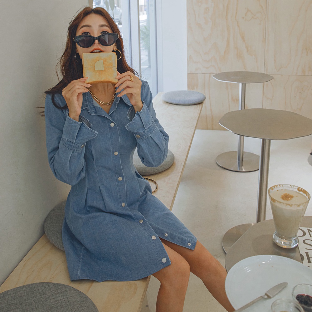 AIR SPACE LADY 排釦打褶襯衫牛仔洋裝(藍) 女裝 現貨