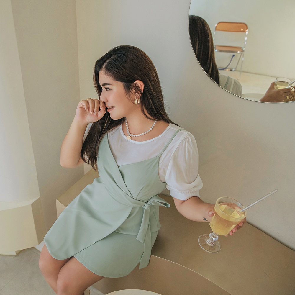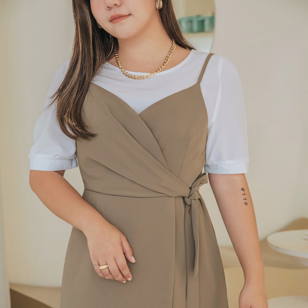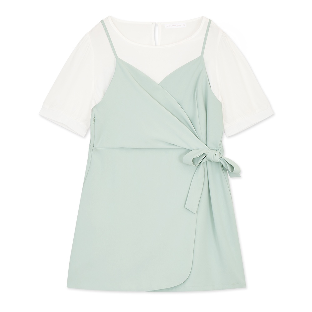 AIR SPACE LADY 中大尺碼 優雅側綁假兩件短洋裝(灰咖/淺藍) 女裝 現貨 大尺碼
