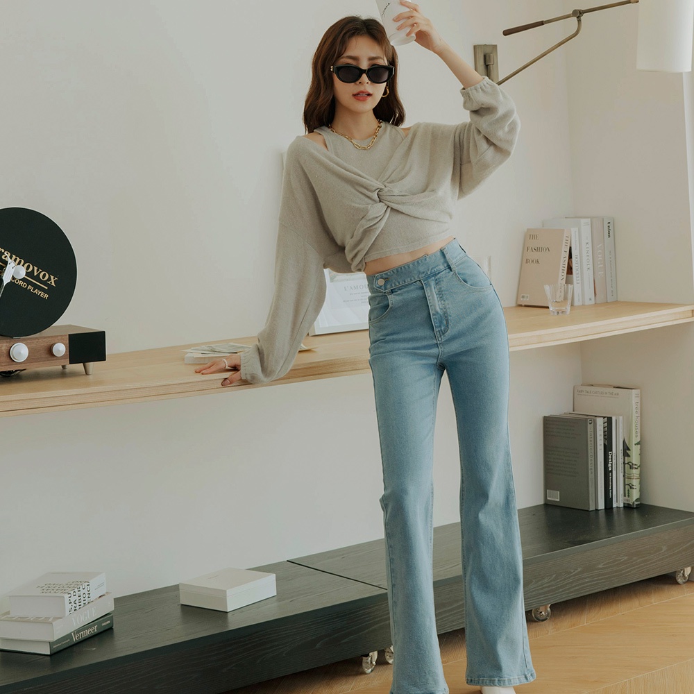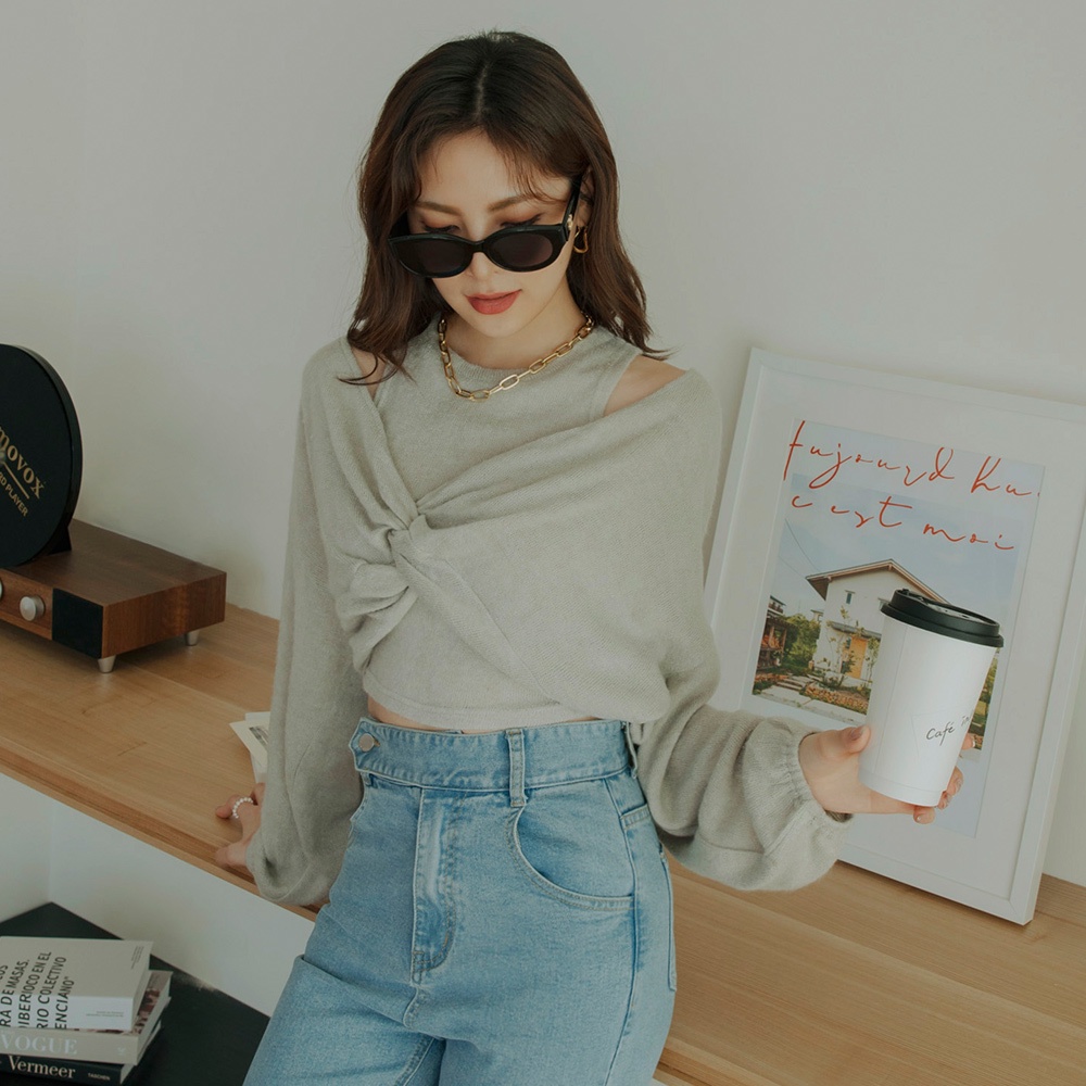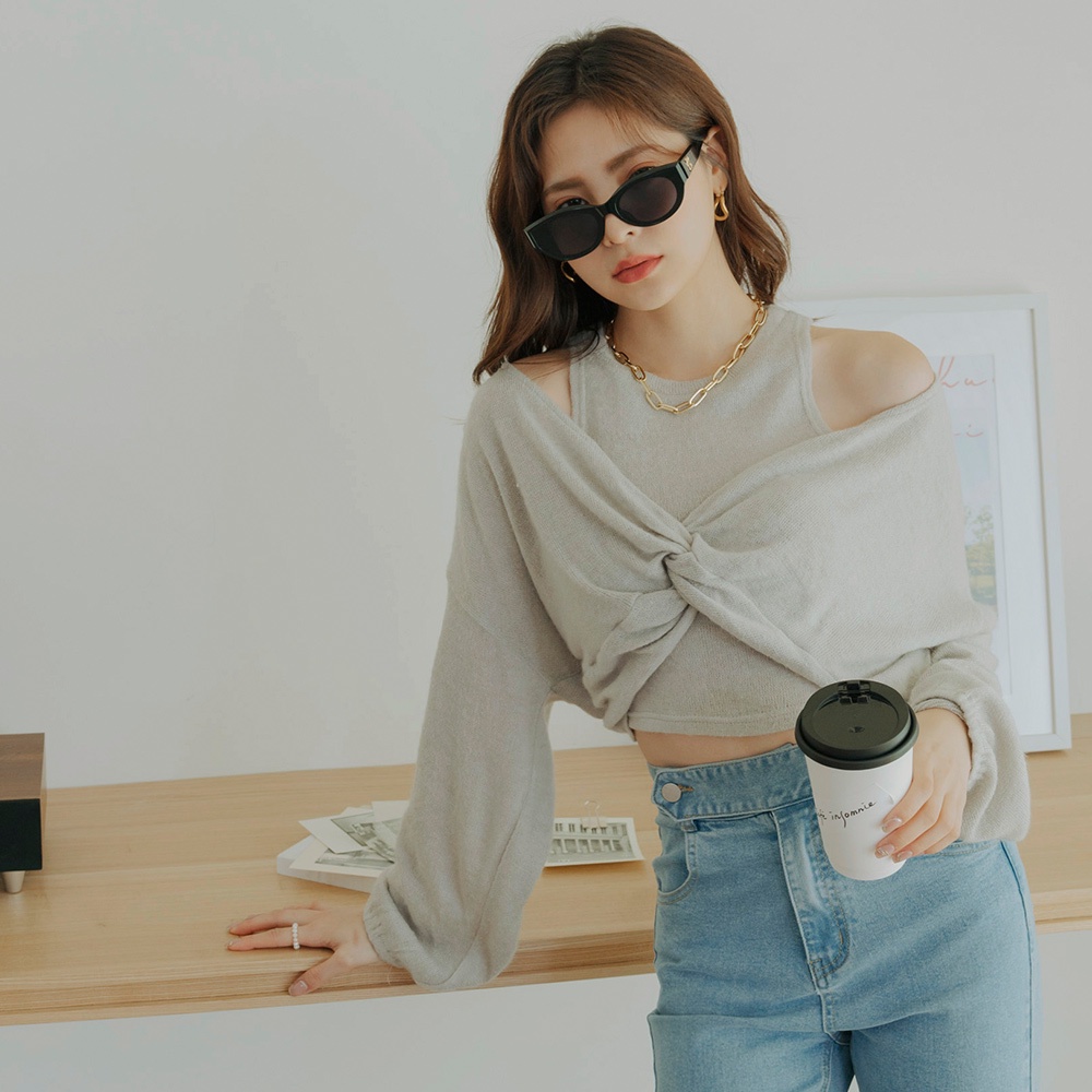 AIR SPACE LADY 扭結澎袖針織兩件式上衣(藍綠/灰) 女裝 現貨