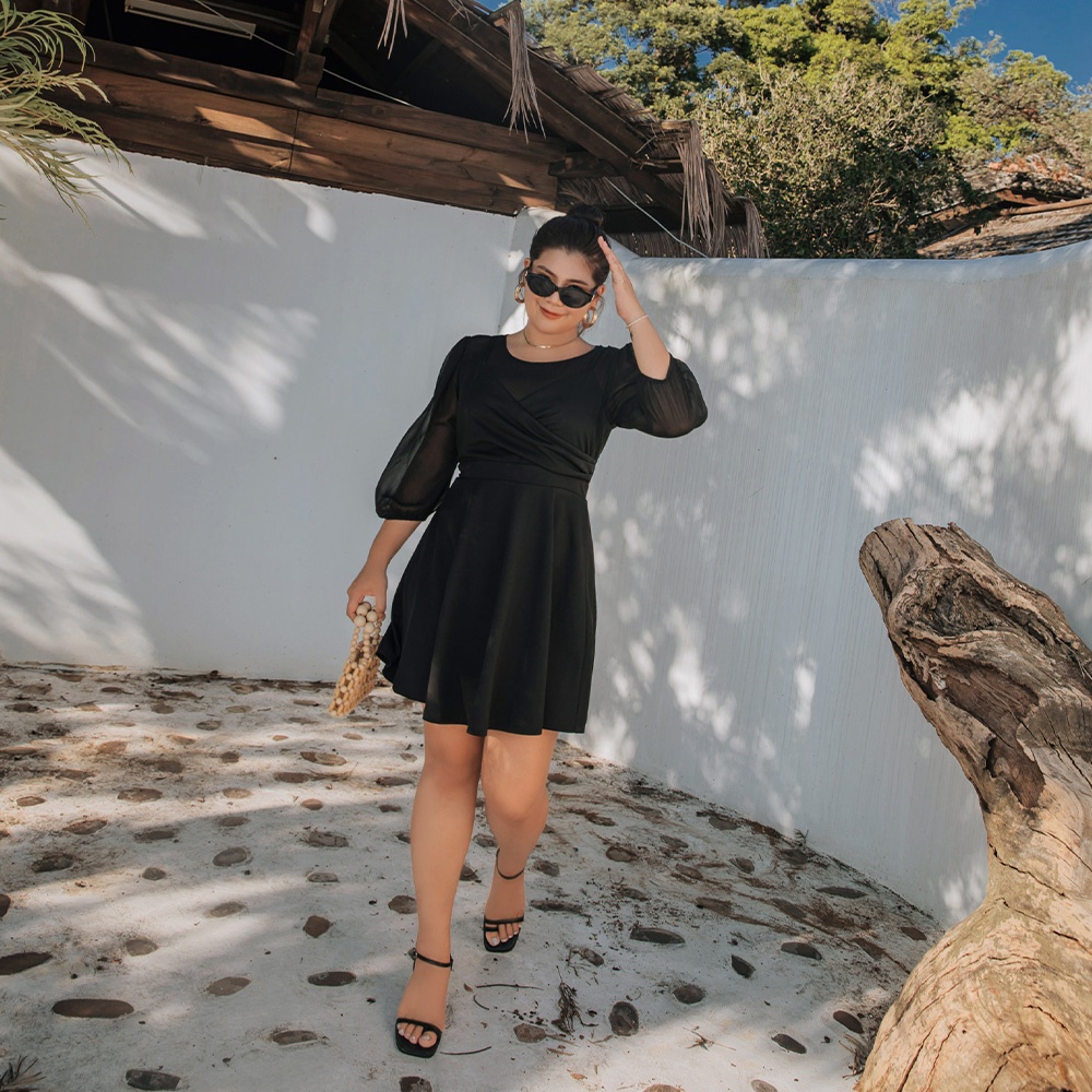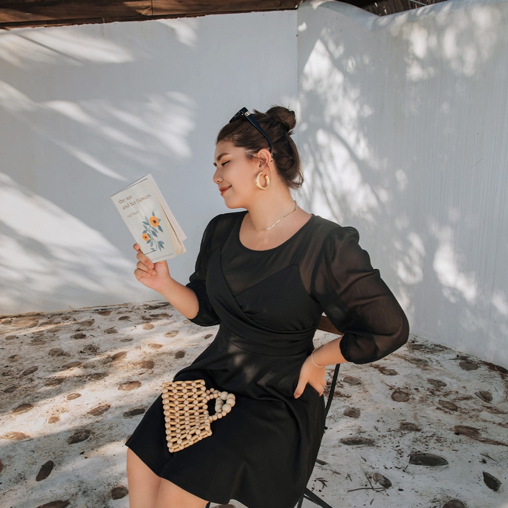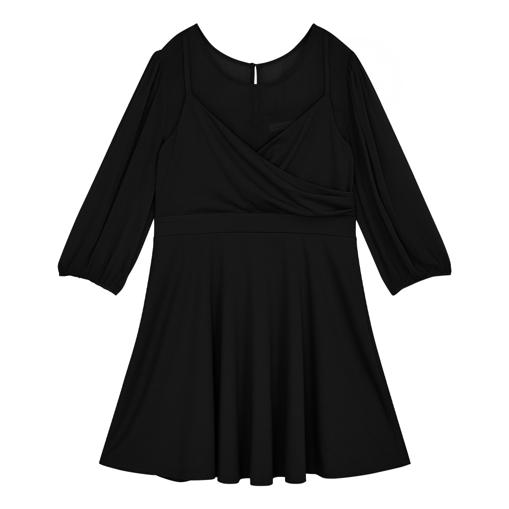 AIR SPACE PLUS 甜美假兩件澎袖短洋裝(黑/灰藍) 女裝 現貨 大尺碼 中大尺碼
