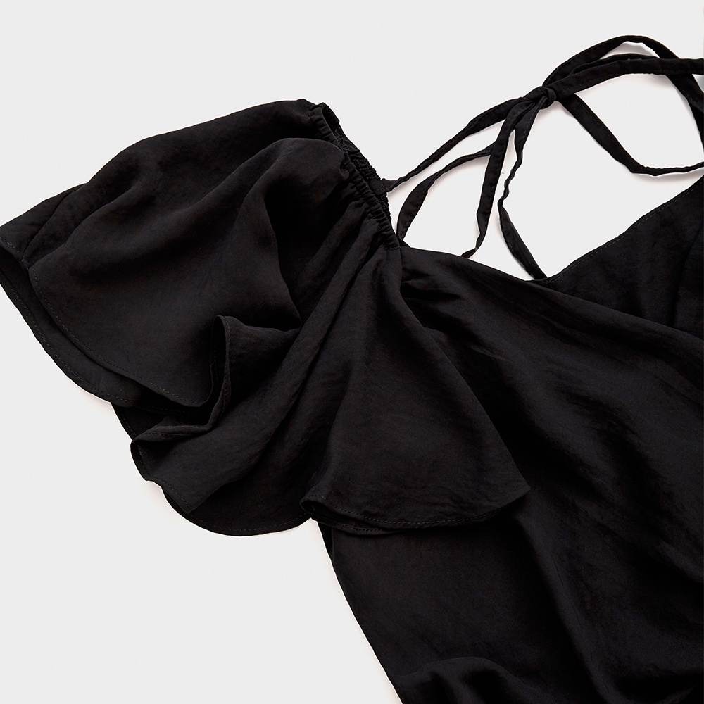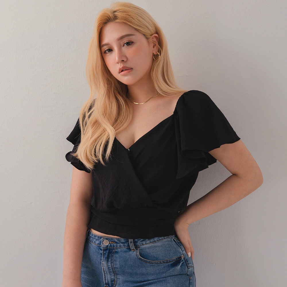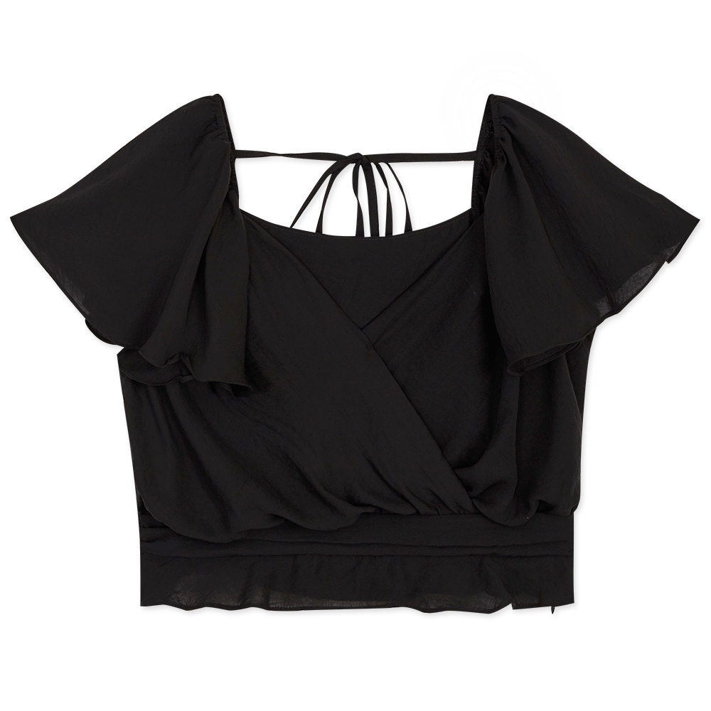 AIR SPACE PLUS 中大尺碼 渡假感荷葉袖短版上衣(黑)