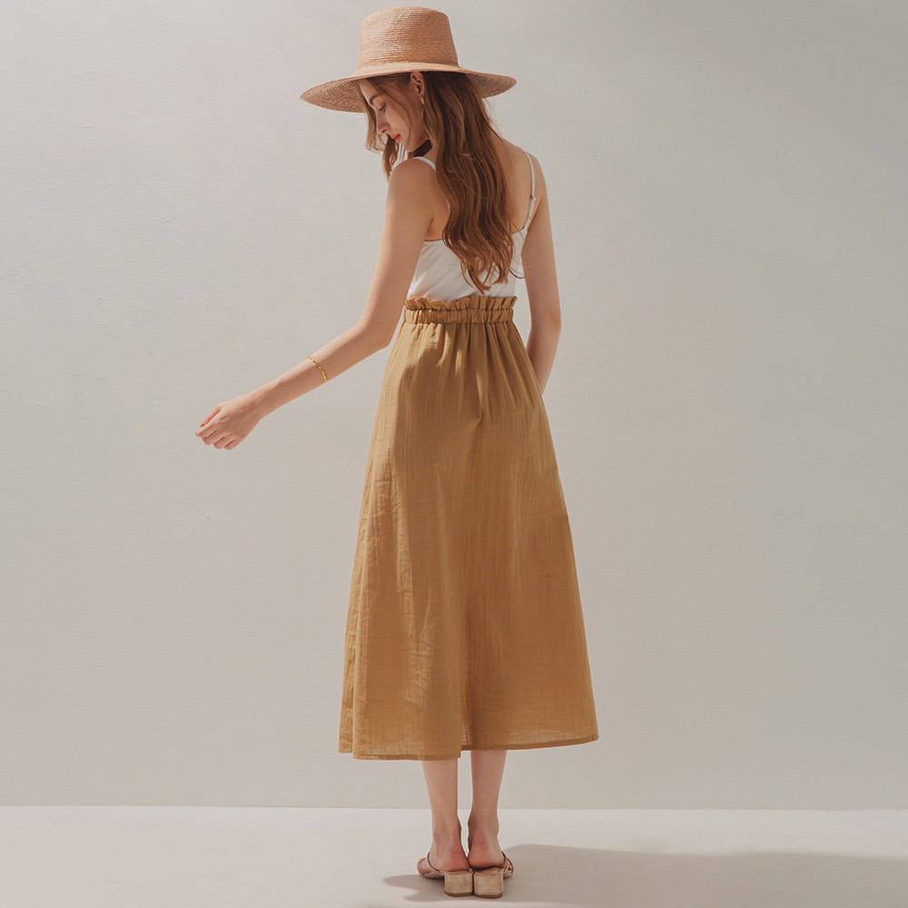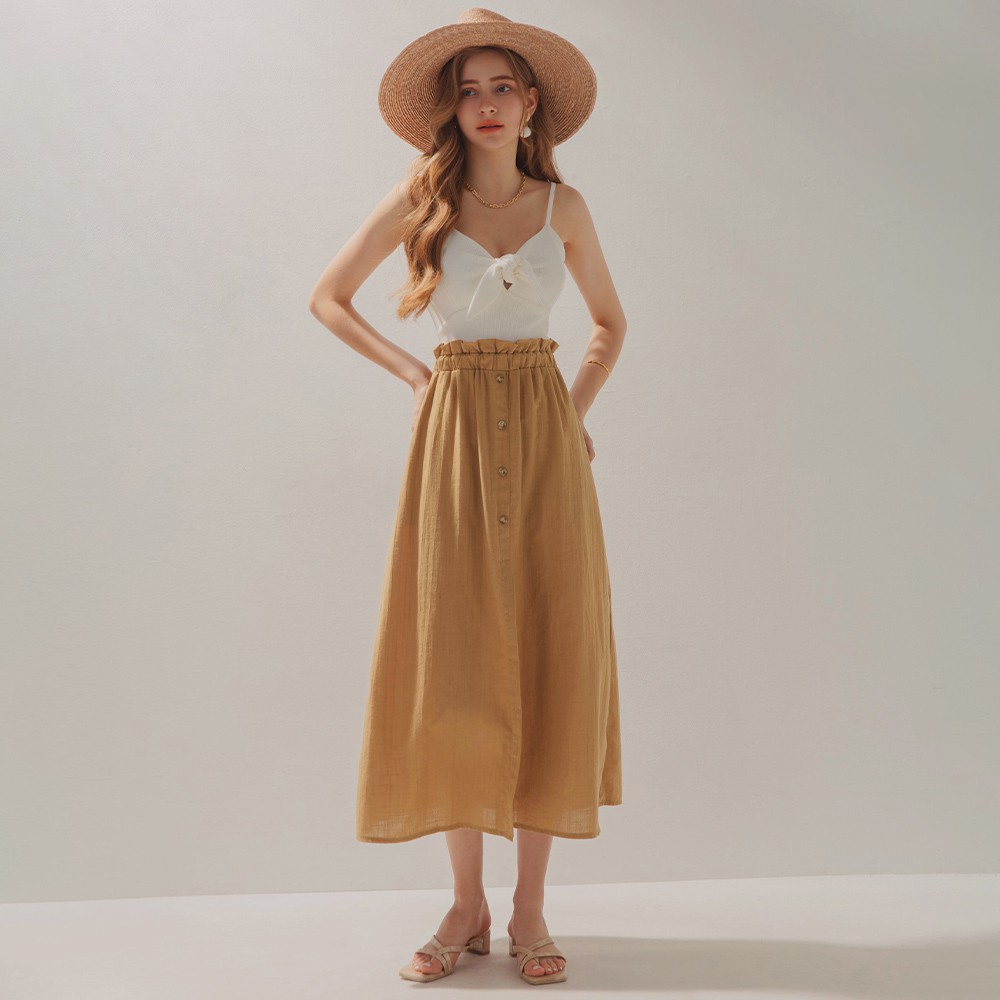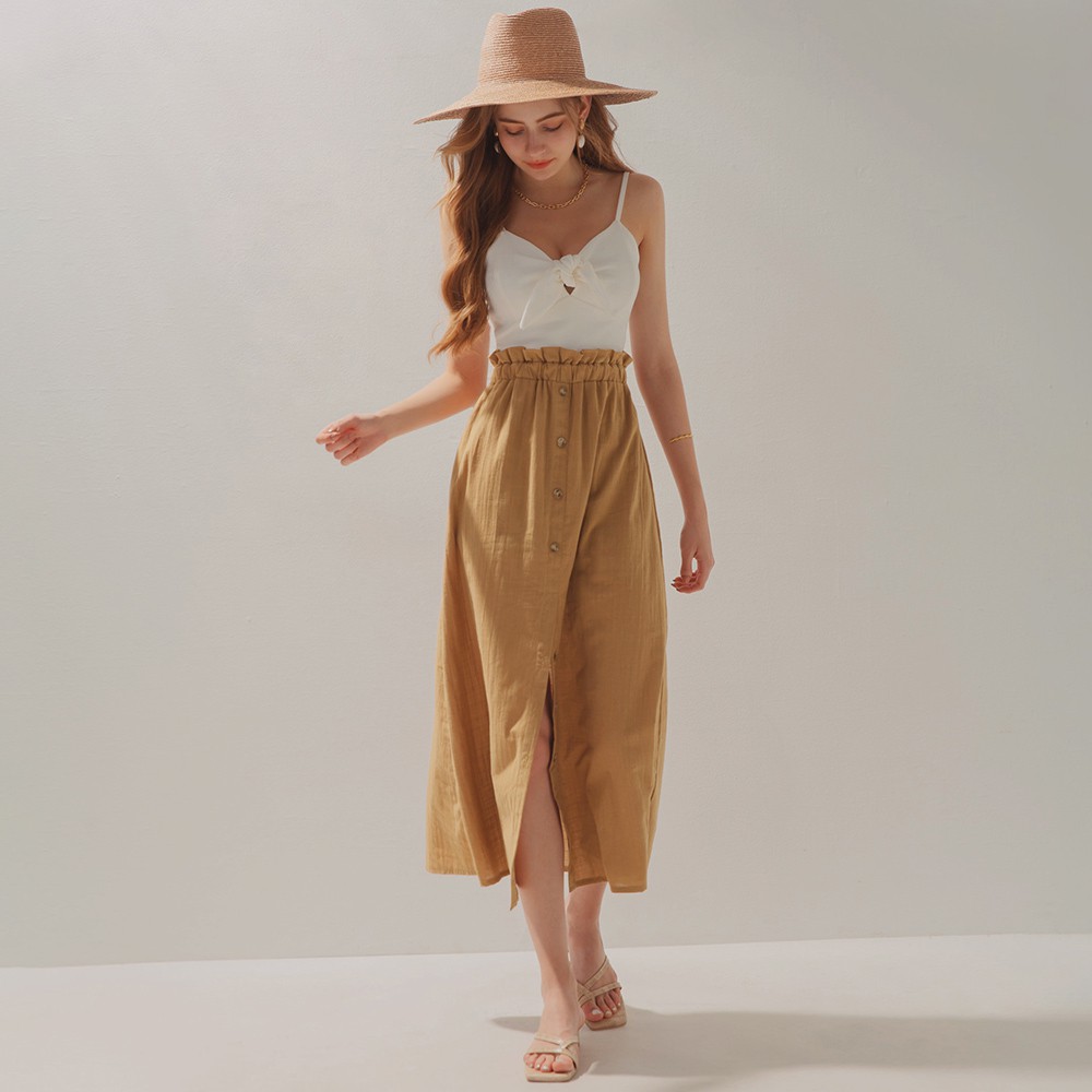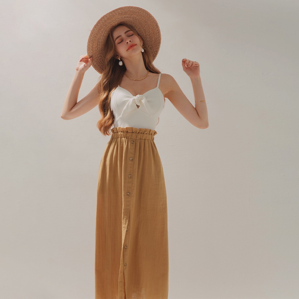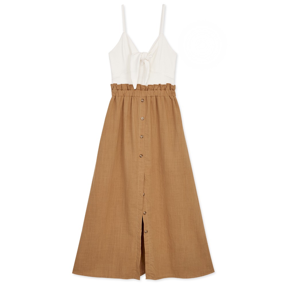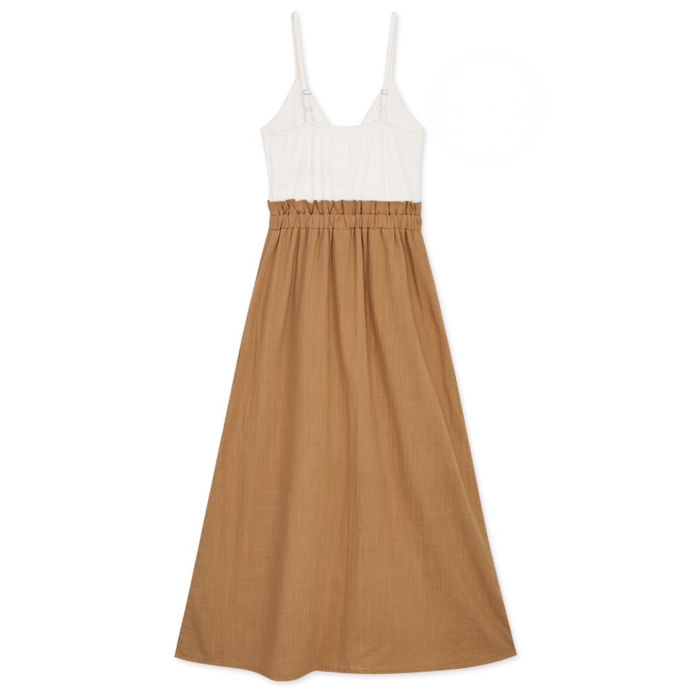 AIR SPACE 細肩前綁帶拼接鬆緊開衩長洋裝(黃)