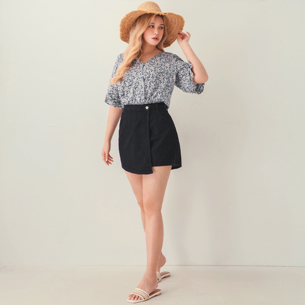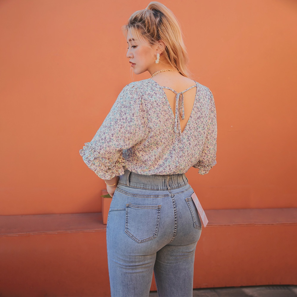 AIR SPACE PLUS 中大尺碼 荷葉邊袖短版碎花上衣(藍/紫)
