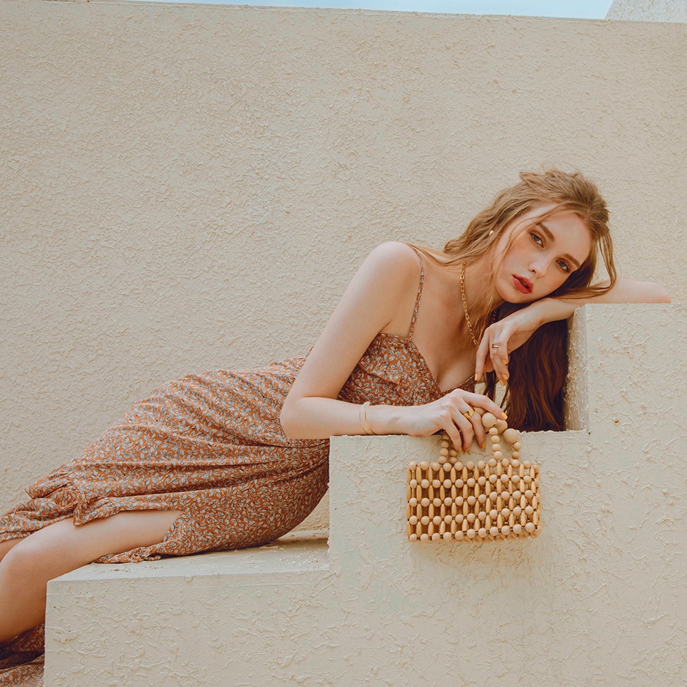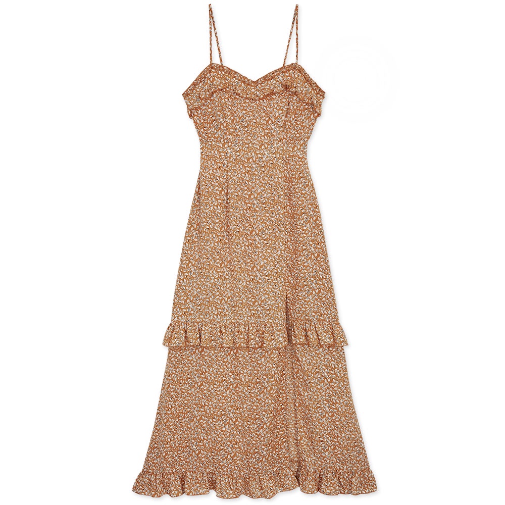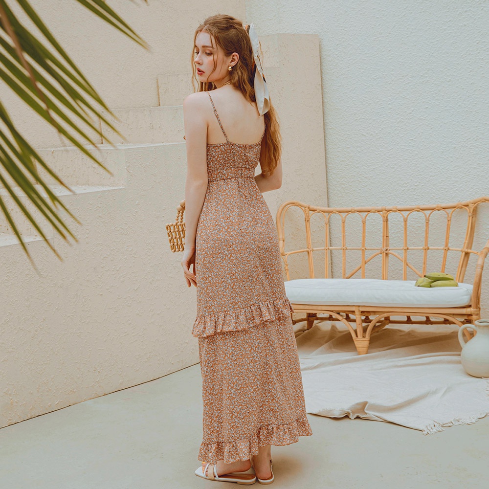 AIR SPACE 渡假印花細肩桃心領開衩長洋裝(藍/黃)