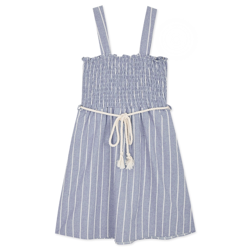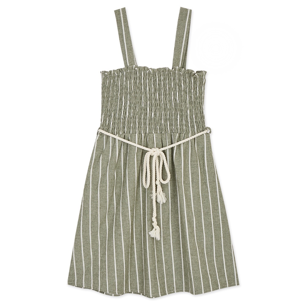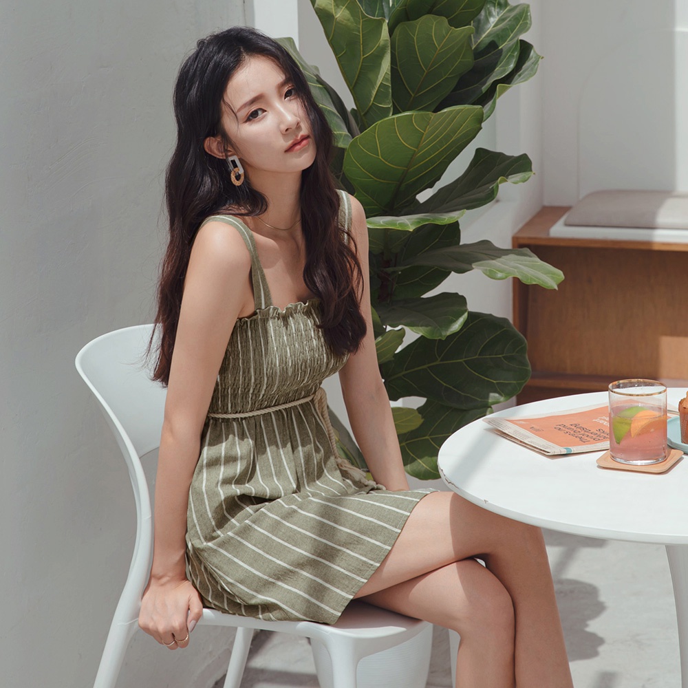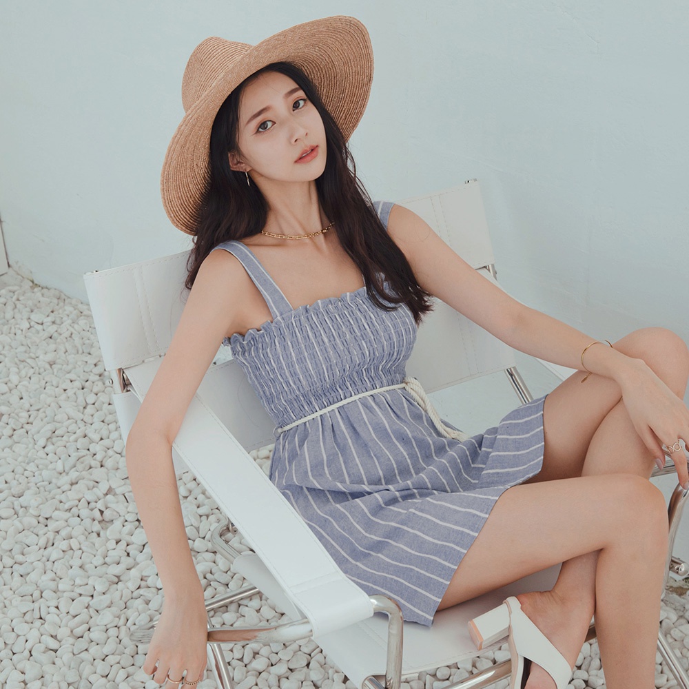 AIR SPACE LADY 棉麻條紋皺皺短洋裝(附腰帶)(藍/綠)