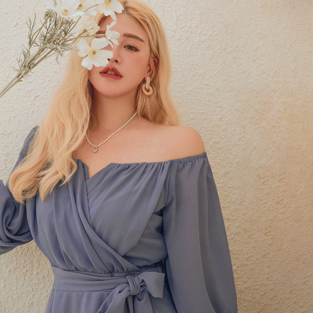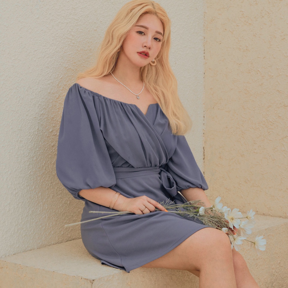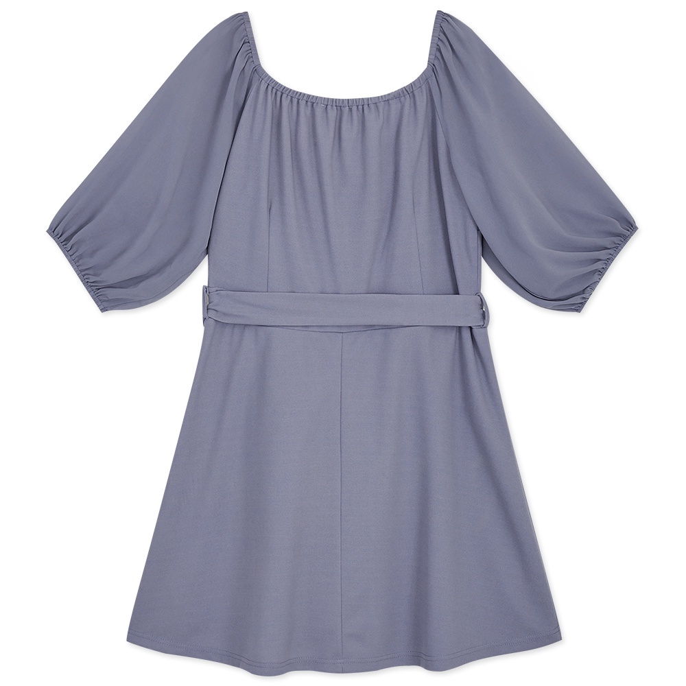 AIR SPACE PLUS 中大尺碼 V字細節五分袖雪紡短洋裝(附腰帶)(灰藍)