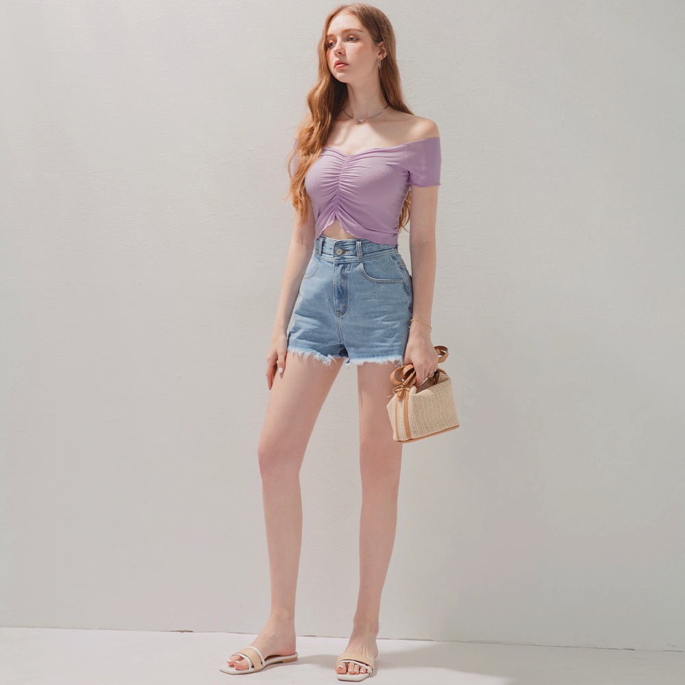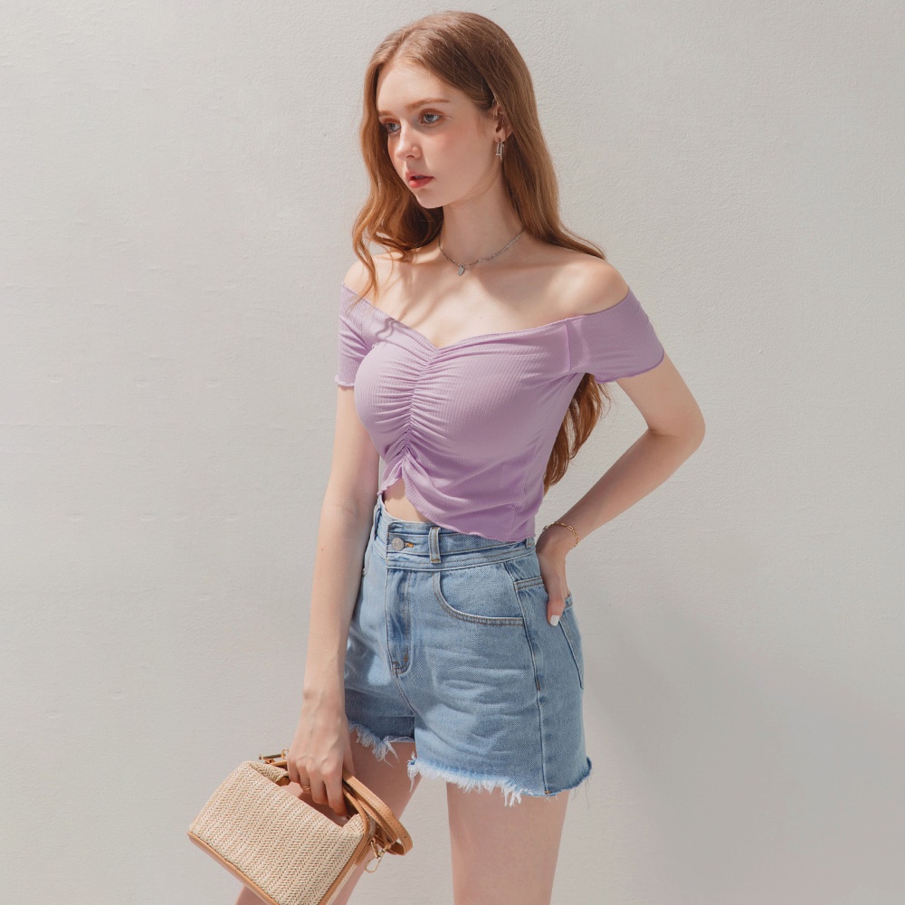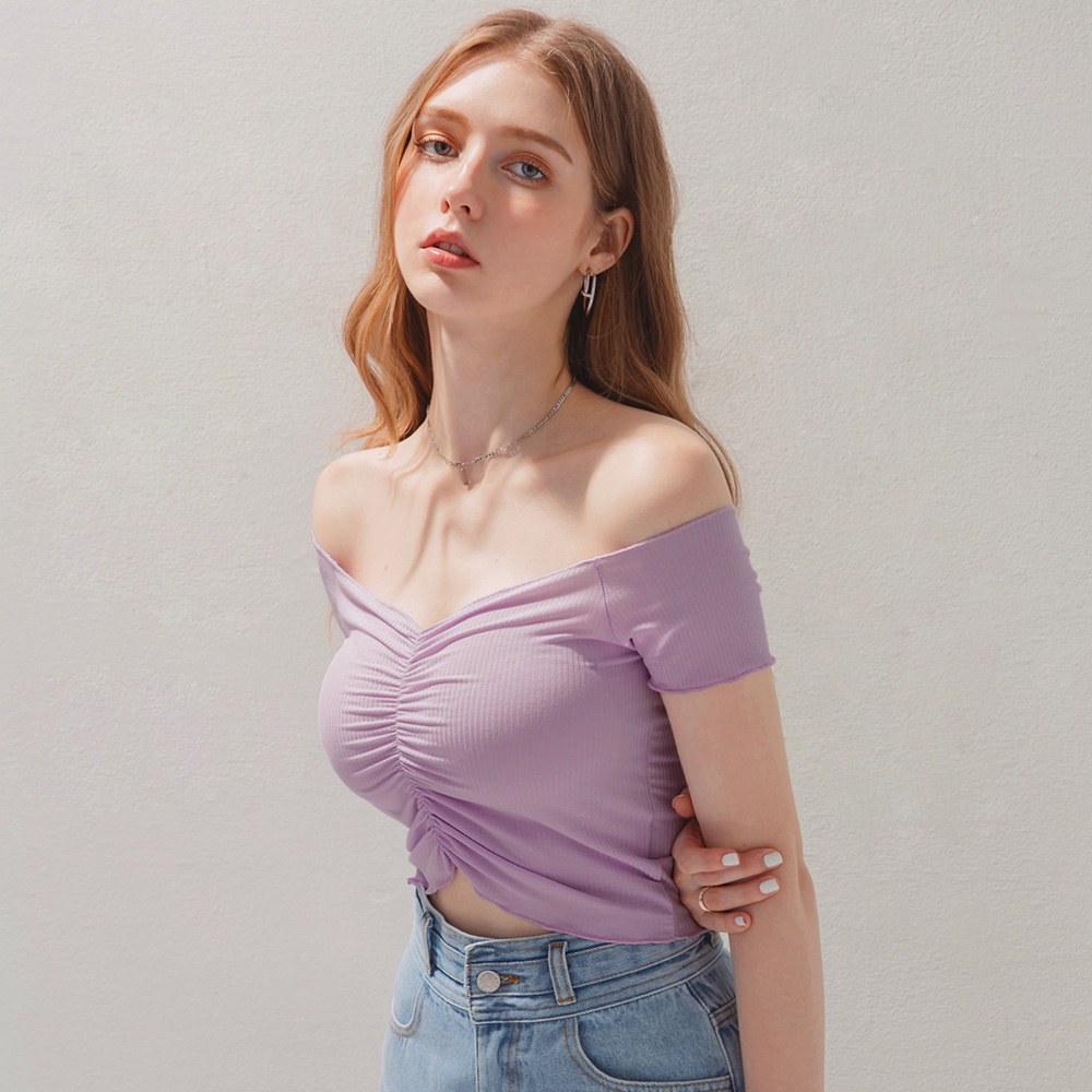 AIR SPACE 涼感一字領抓皺短版上衣(紫)