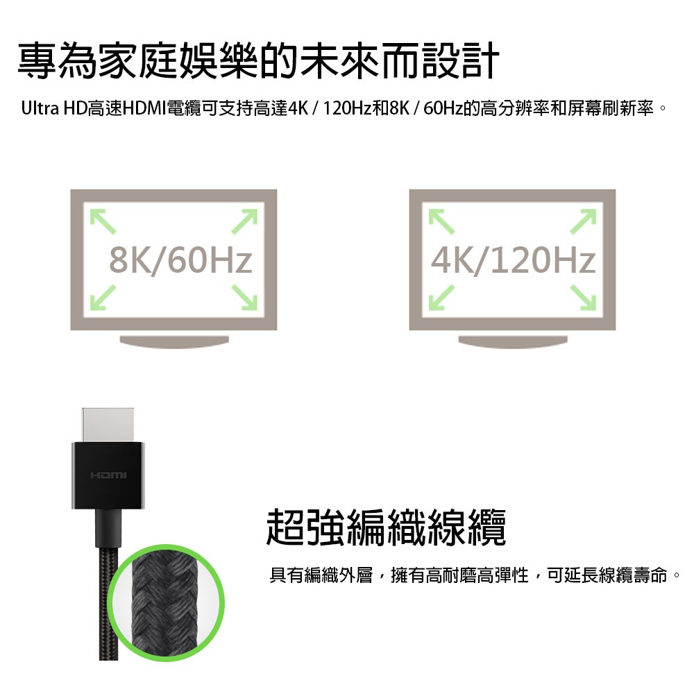 【Belkin】貝爾金UltraHD 4K/8K 超高速HDMI連接線 編織款 - 售完為止