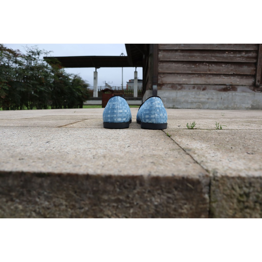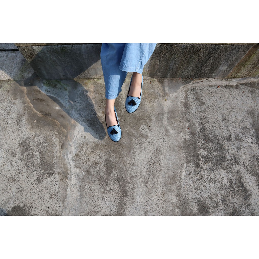 凡人與路-Monazu手工鞋工作室 真皮內裡紮染流蘇樂福鞋 淺格藍