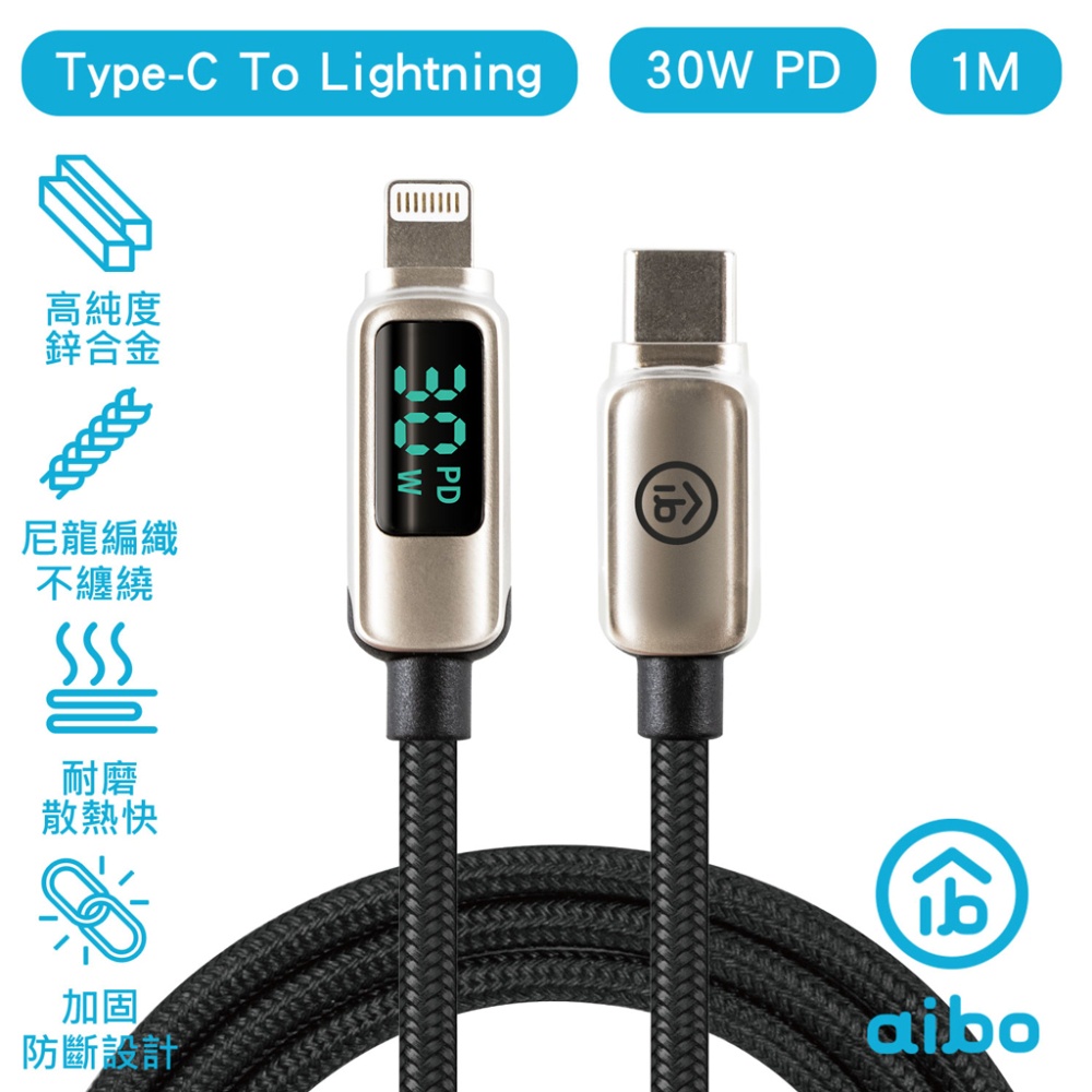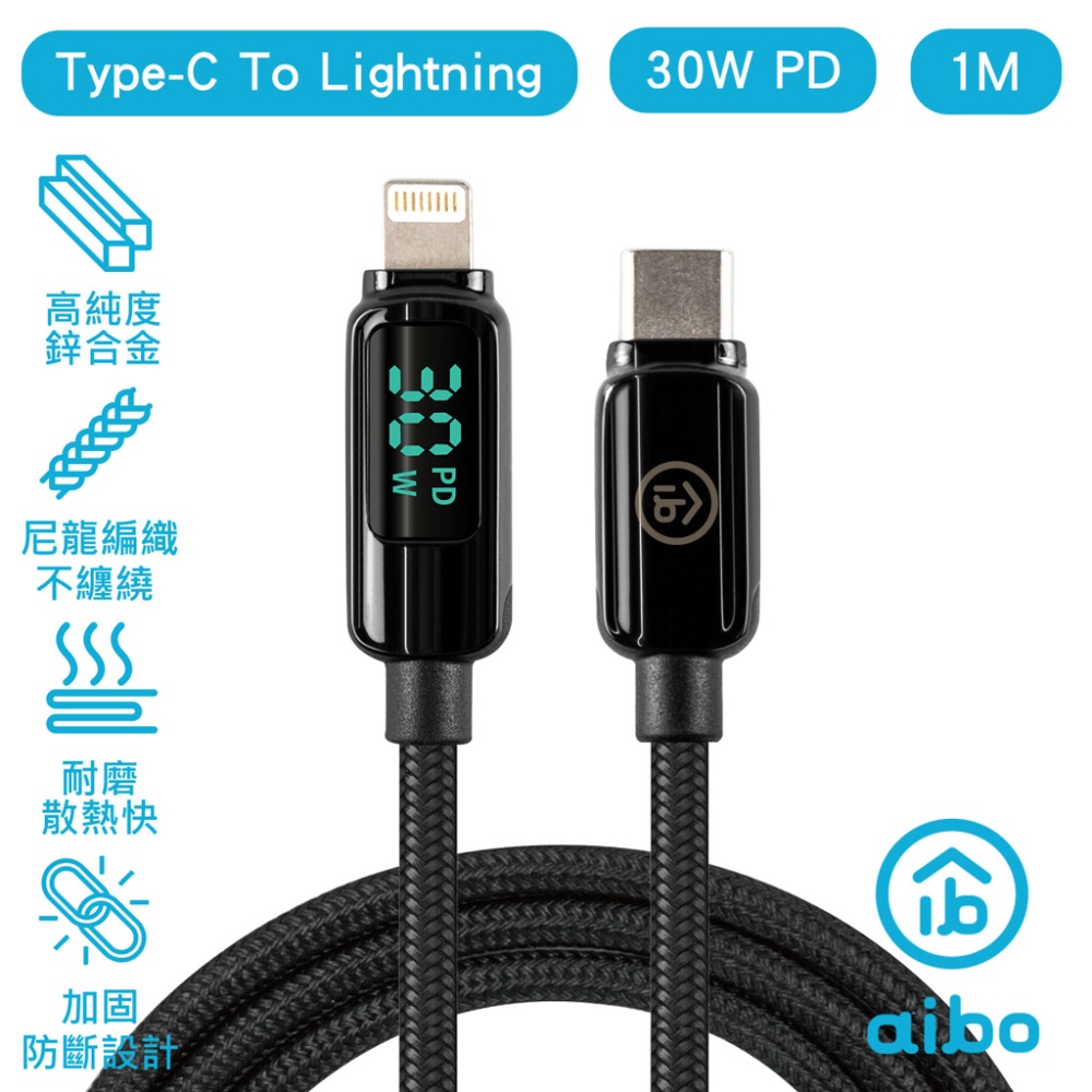 aibo 極速快充 PD30W 數位顯示 Type-C to 8PIN 快充傳輸線 PD線 快充線 蘋果快充線 【現貨】