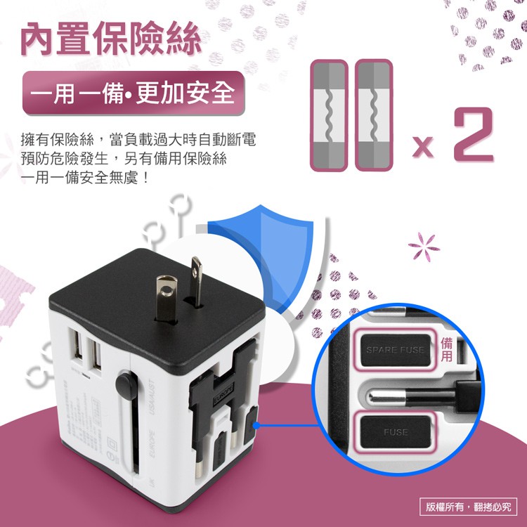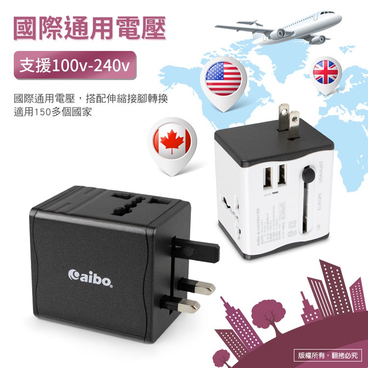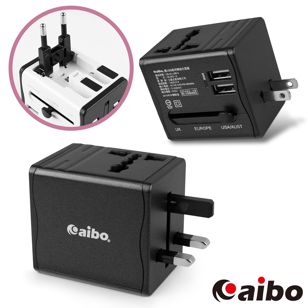 aibo 全球通用 雙USB萬用轉接充電器 2.1A 黑色【現貨】 國際通用電壓 萬國插座 萬用充 多國轉接頭 轉接頭