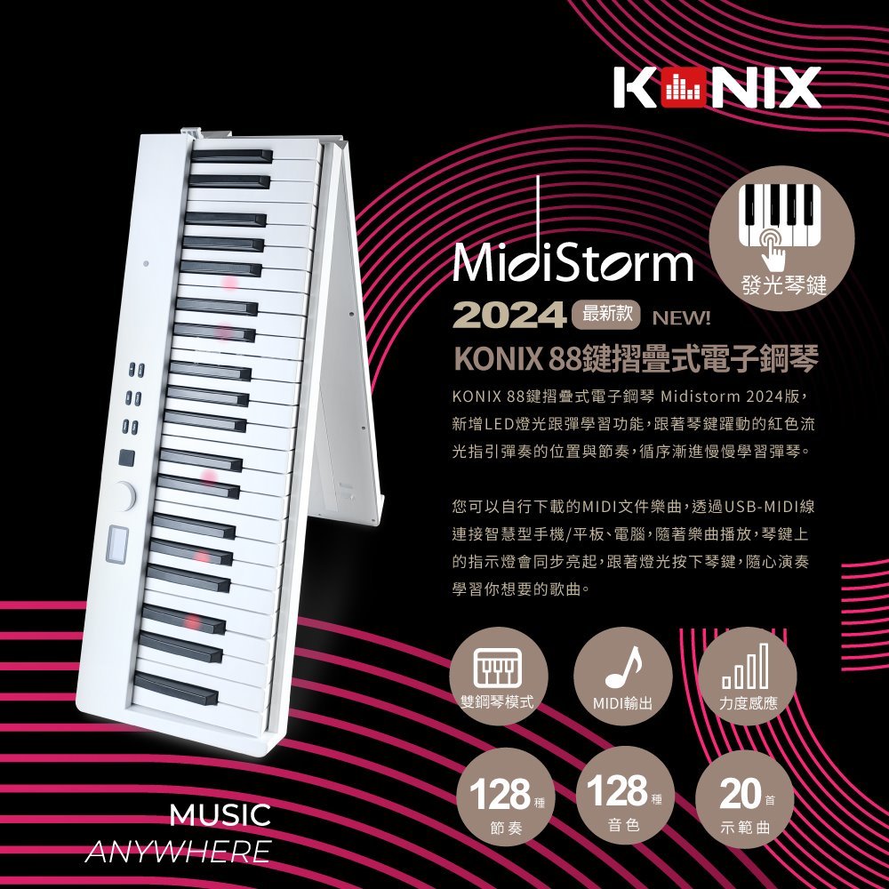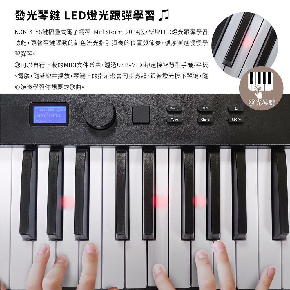 【KONIX】88鍵摺疊式電子鋼琴 Midistorm 2024版 LED智慧燈光學習 可攜式電子琴 摺疊數位鋼琴