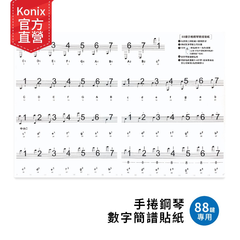 【KONIX】科尼斯台灣公司原廠產品 數字簡譜貼紙88鍵手捲鋼琴專用 貼紙 初學 兒童幼兒