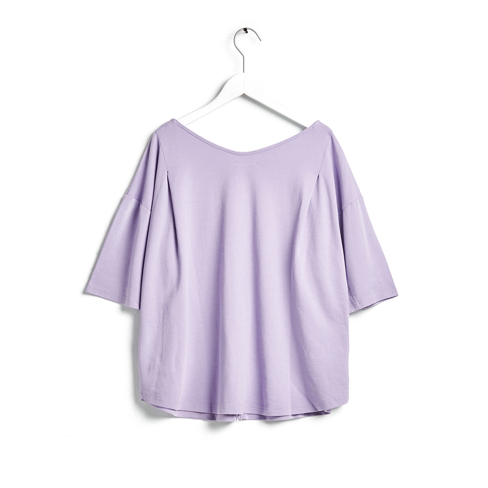 SOMETHING 女款 打褶造型寬版V領開襟短袖襯衫(粉紫色)