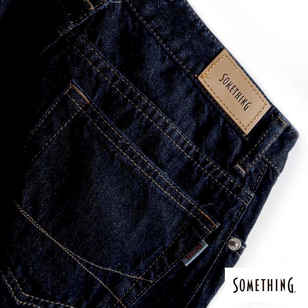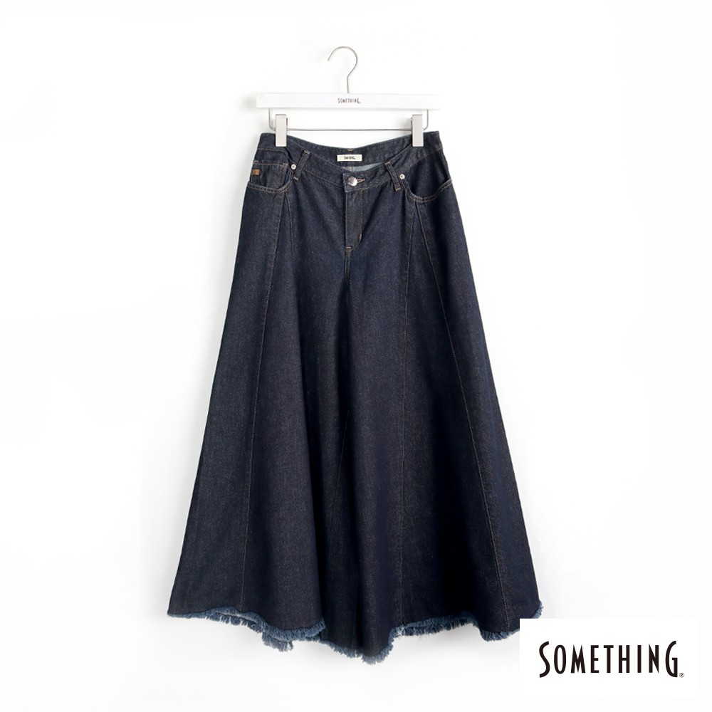 SOMETHING 女款 剪接寬版牛仔褲(原藍色)