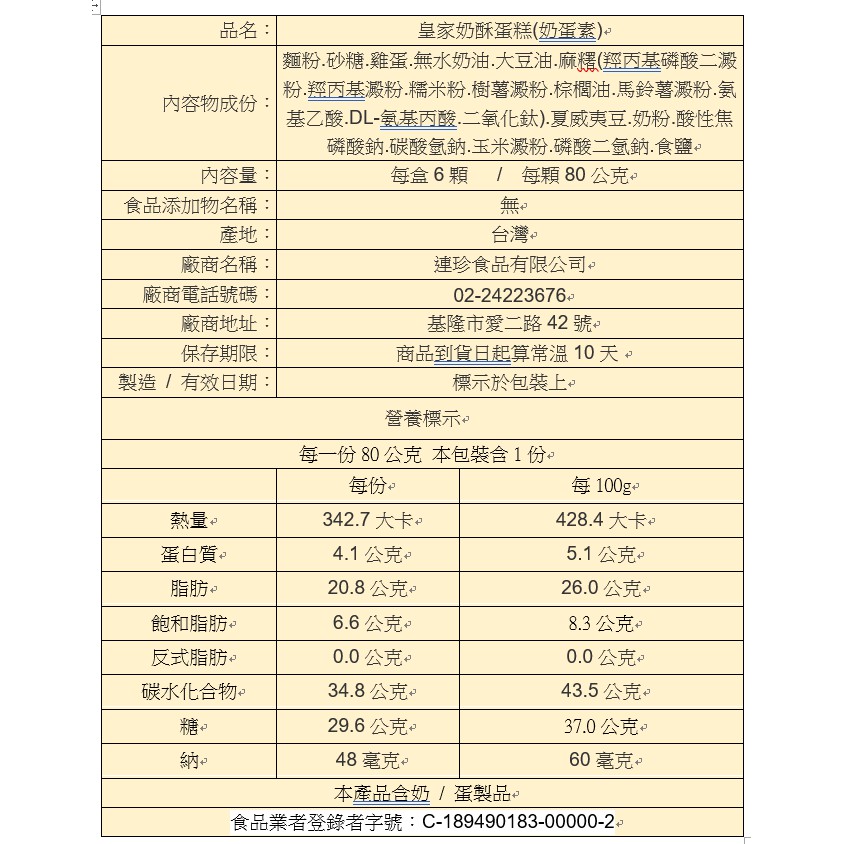 【連珍】連珍皇家奶酥蛋糕(6入)