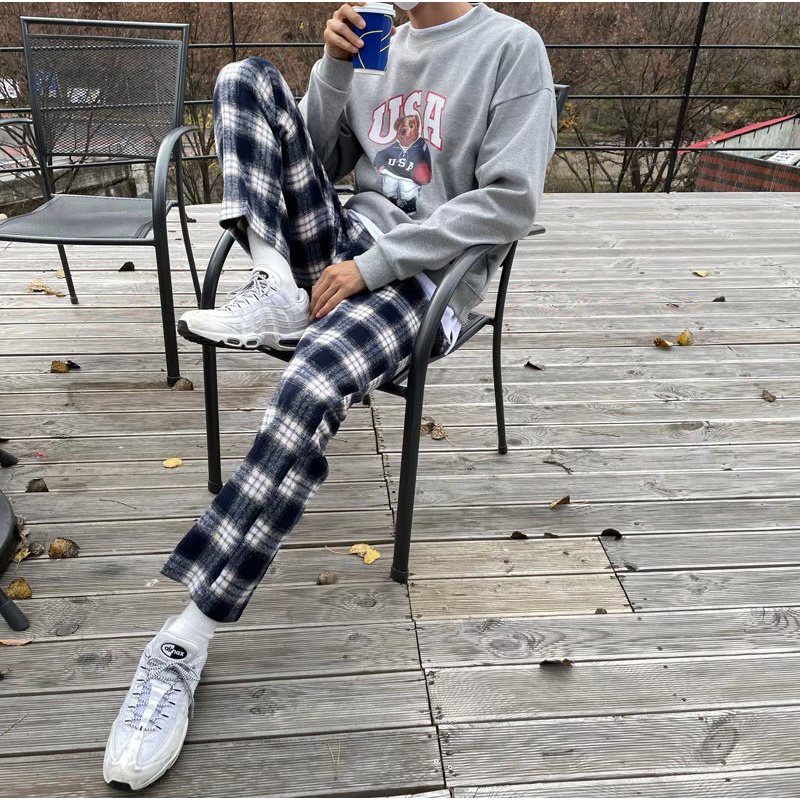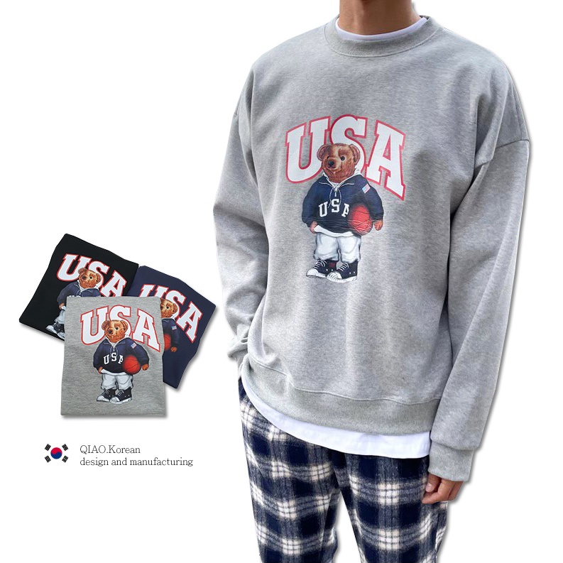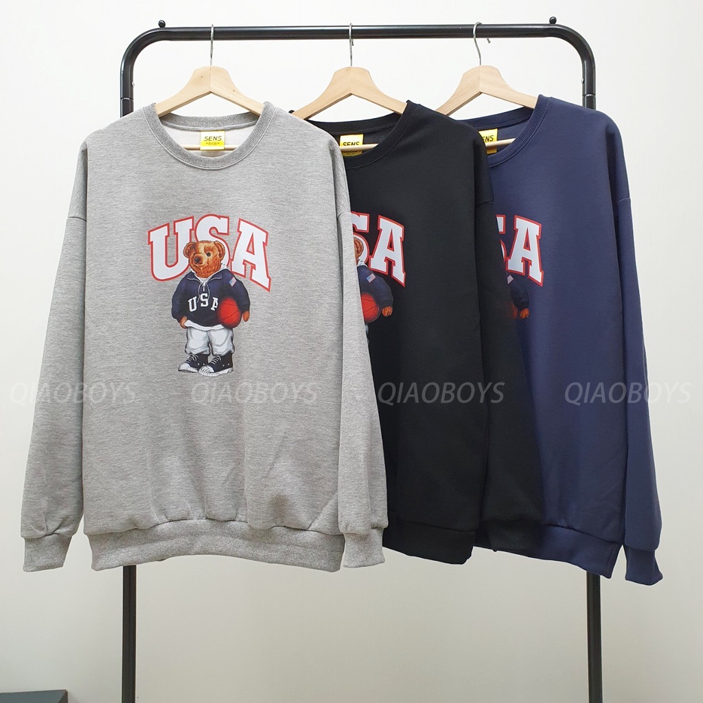 QIAO 韓國新貨 USA 熊熊大學T 搶購款 太空棉 寬鬆 落肩 男女都愛 束口 韓國大學T 長Tee 長袖 韓國男裝
