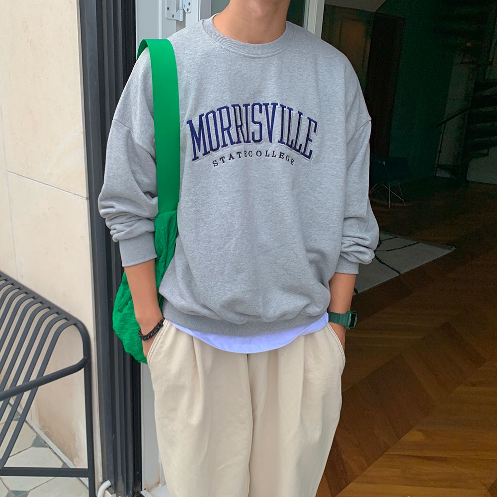 QIAO 韓國新貨 內刷毛 北卡MORRISVILLE 殘影電繡 寬鬆大學T 落肩 高磅 保暖 長袖 T恤 正韓 帥