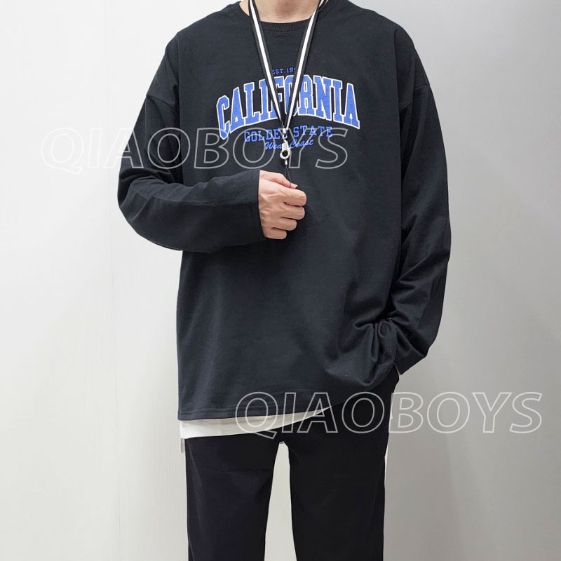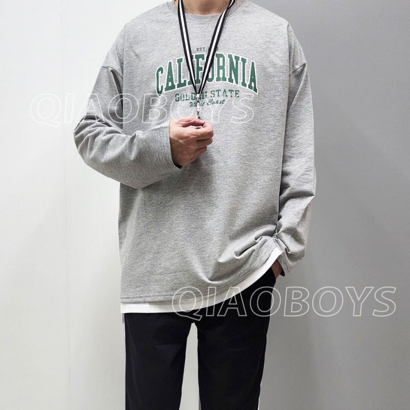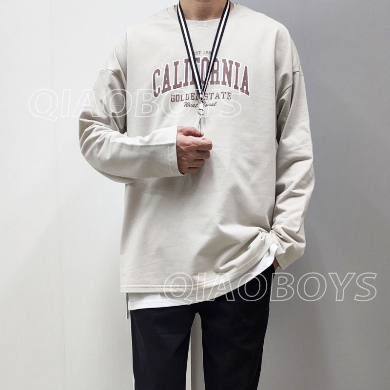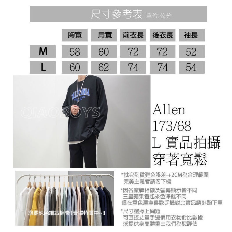 QIAO 韓國 薄長袖 美式印刷 單穿 落肩 細絨棉 寬鬆 薄長T 穿搭 衣服 情侶 聖誕 露營 韓 上衣 長袖 男T