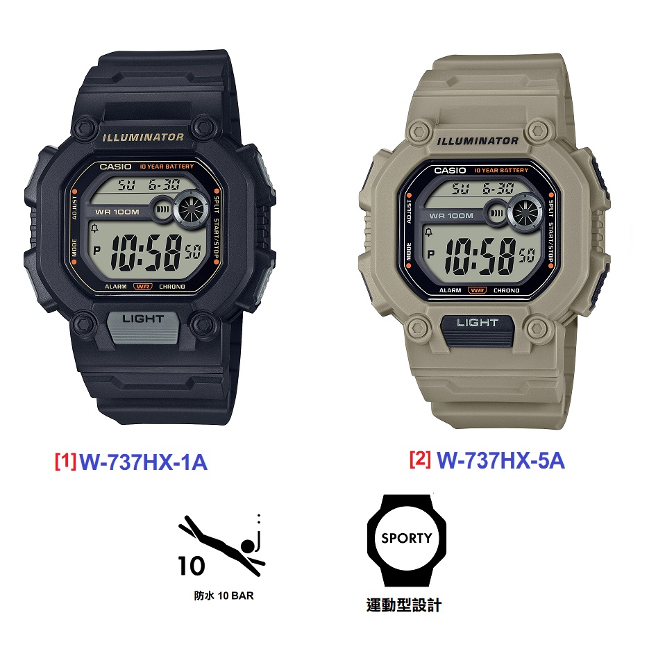 CASIO 卡西歐錶款也搭載碼錶、鬧鈴、定時器防水100米 W-737HX-1A W-737HX-5A