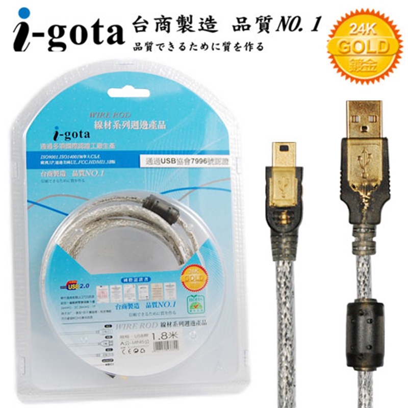 I-gota 透金 USB 轉 mini 1.8米 傳輸線 B-USBAM5PP02P /紐頓e世界
