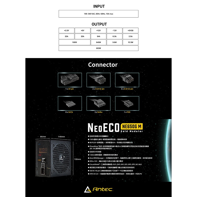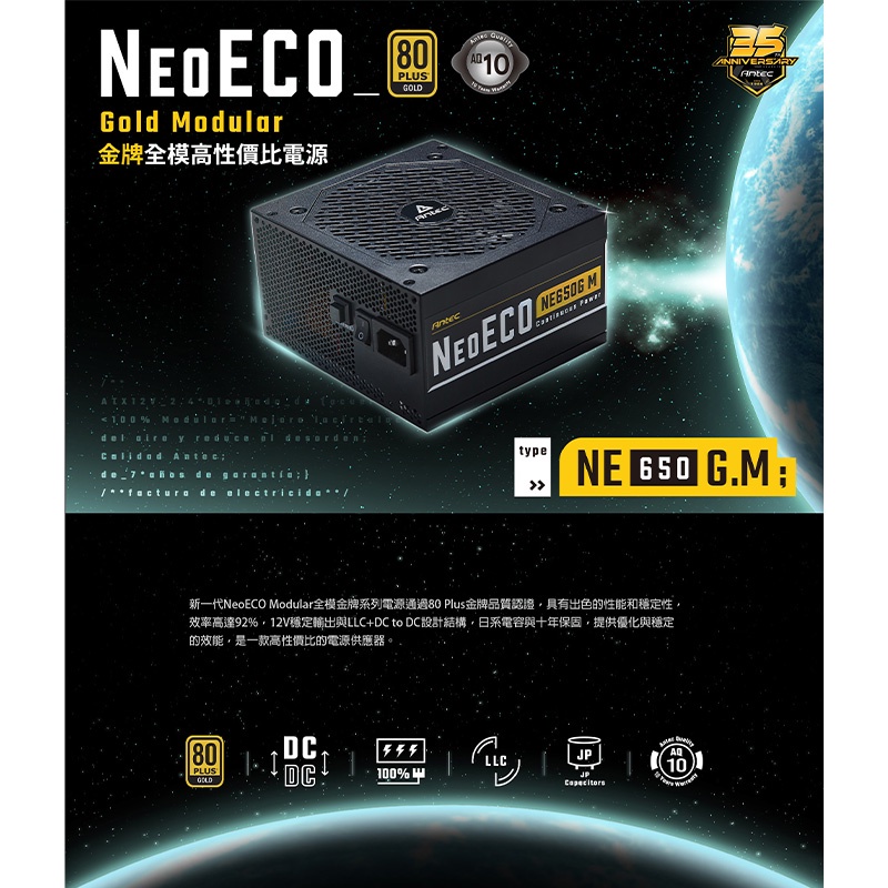 Antec 安鈦克 NE650G M 80+金牌 全模組 650W 電源供應器 10年保 /紐頓e世界