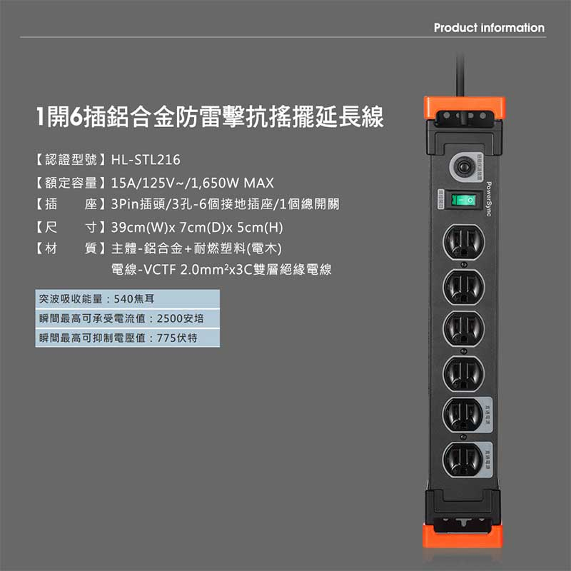 PowerSync 群加 TL6W0018 1開6插 1.8M 鋁合金 防雷擊 抗搖擺 延長線 黑色 /紐頓e世界
